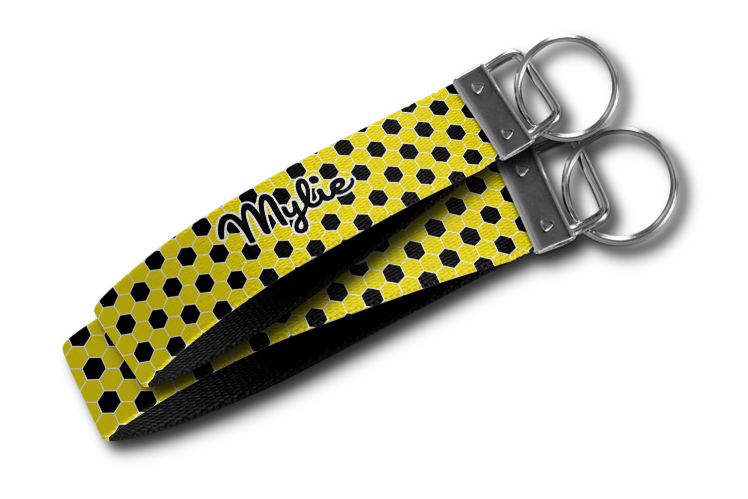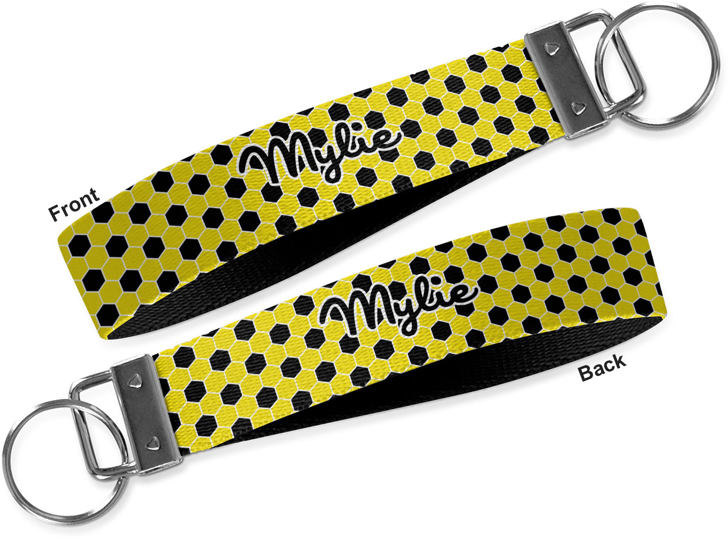 These key fob keychains are made from a polyester weave, right here in the USA. They feature a silver, metal clasp, attached to a round keyring. The piece gives the personalized wristlet a beautiful, finished look. Your customized design is printed on the outside of the keychain strap. We carry these wristlets in two sizes: small, which is 5 inches in width, and large, which is 5.5 inches in width.