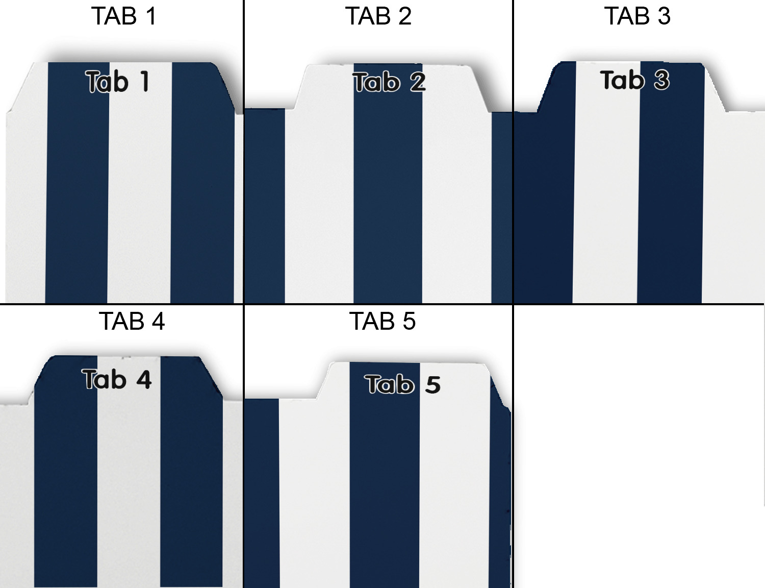 Whether you use binders at school or at work, we have designs to suit all of them. Available in 5 or 6 tab sets, you are sure to find a set to suit your needs. The back of each one is white and can be used to take notes, write vital information on, etc.