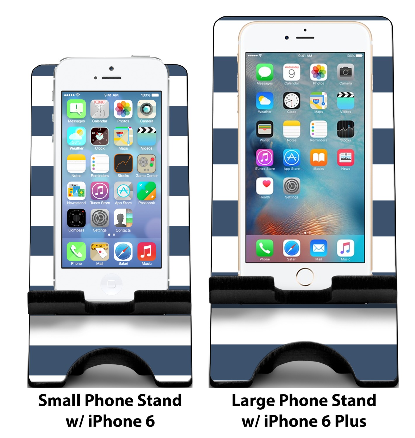 To meet your needs, we offer four variations of this IPhone stand. The backboard of the first version is shaped as a plain, yet sleek rectangle, and is available in two sizes. Our smaller size is approximately 4 by 3.25 by 7 inches, while the larger model is 4 by 3.77 by 8.5 inches. Alongside this model, we also provide you with a more decorative option. The upper part of our second version features a curved edge, for a classy, suave appearance. This phone holder is also sold in two sizes: a smaller version, which is 4 by 3.25 by 7 inches, and our larger model, which is 4 by 3.77 by 8.5 inches. Both models will support large phones, but the larger model is better if you wish to proudly display your personalized design.