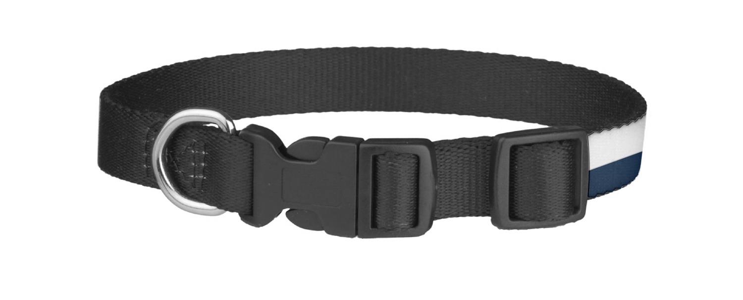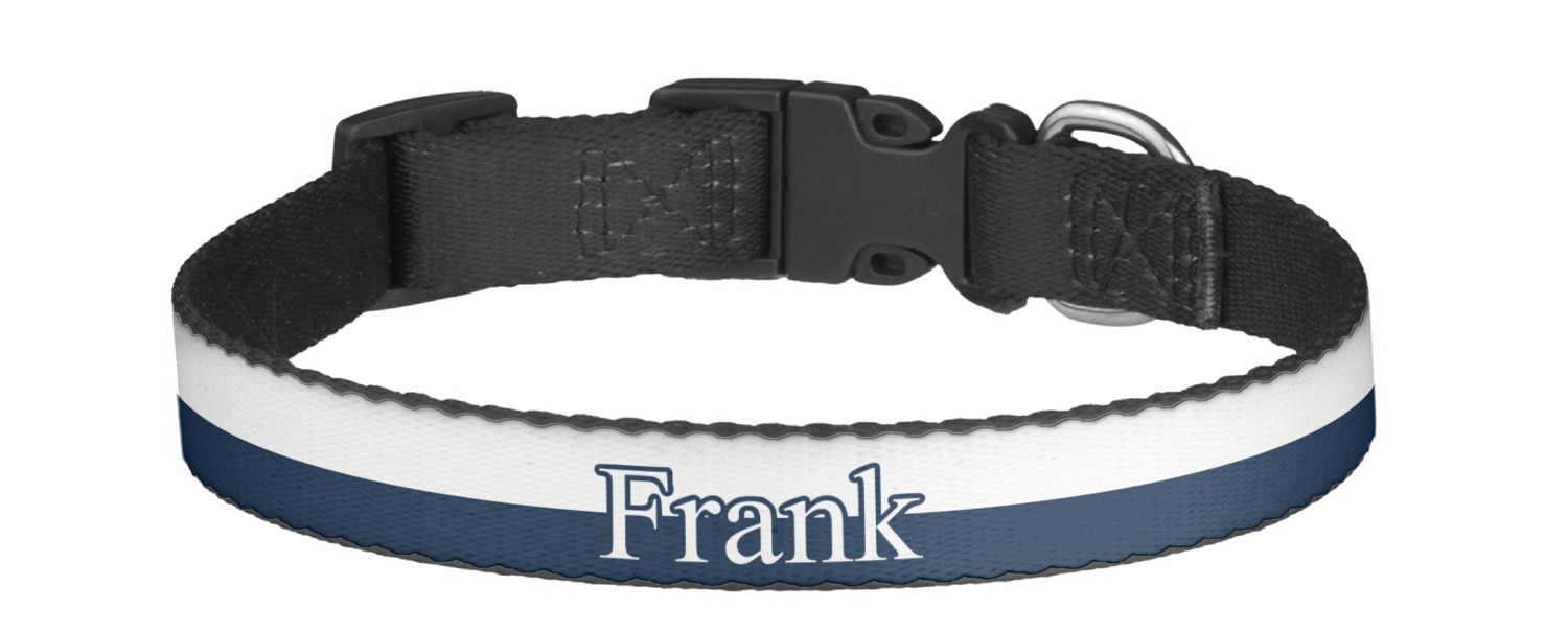 This sturdy collar, made from a durable nylon weave, will outlive your dog's episodes of excited tugging and pulling. Courtesy of its thick plastic buckle and adjuster, this collar is adjustable and accommodating of any dog. Structurally, the collar is a single piece of nylon weave that is sewn together, and features a solid metal loop where you can attach a leash or dog tag. We print and display your dog's name and pattern across the middle of the personalized dog collar.