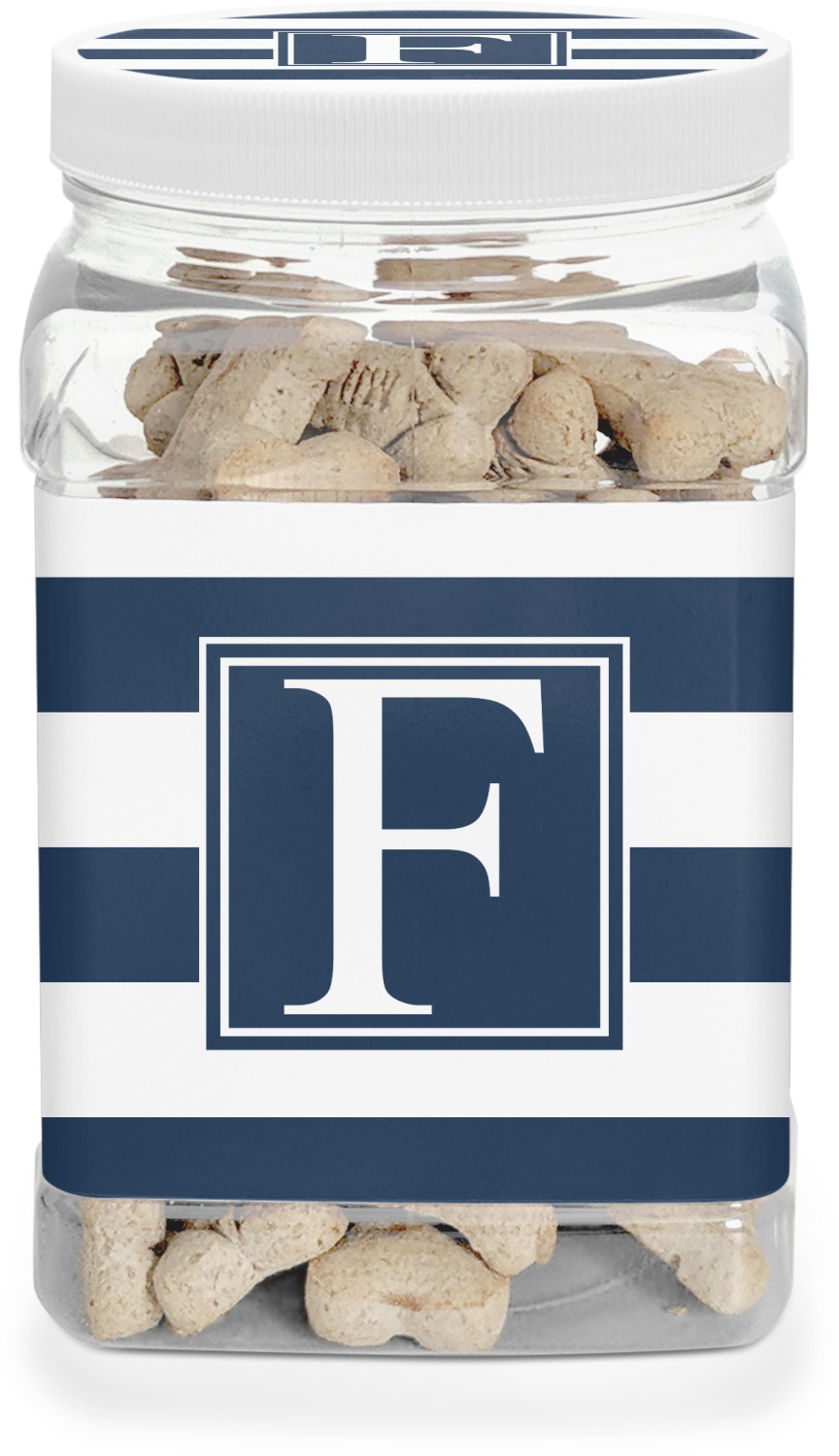 This half gallon jar, made from a sturdy plastic, is the perfect way to keep treats from any naughty pet paws, while still keeping them ready on hand for when your pup performs an impressive trick. This dog cookie jar features a screw-on, white lid that displays your personalized design on a vinyl sticker. We apply another customized sticker that wraps around the front and sides of the jar. Our dog treat jar also has indentations on the rear ends of the sides, which allows for convenient handling, and its square frame allows for easy storage.
