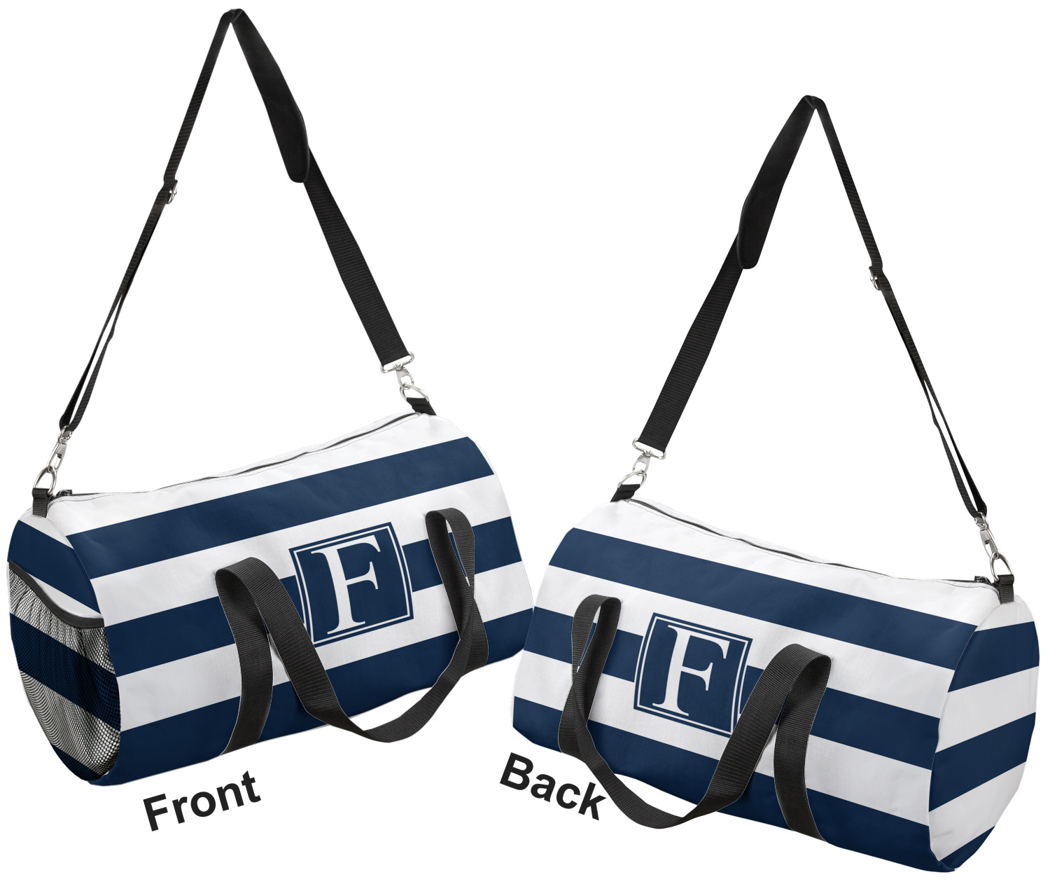 This duffle is a sturdy bag made of a canvas material. It comes in two sizes: Small (19"W x 9.5"H x 9.5"D) and Large (23"W x 12"H x 12"D). The bag is a cylindrical shape with a black adjustable strap and two handles. On one side is an elastic pouch to put a waterbottle or other small item. Your product will be sublimated with your design and is able to be designed on the front, back, and sides. Be sure to remember that the straps may cut into parts of your design if you upload your own artwork.