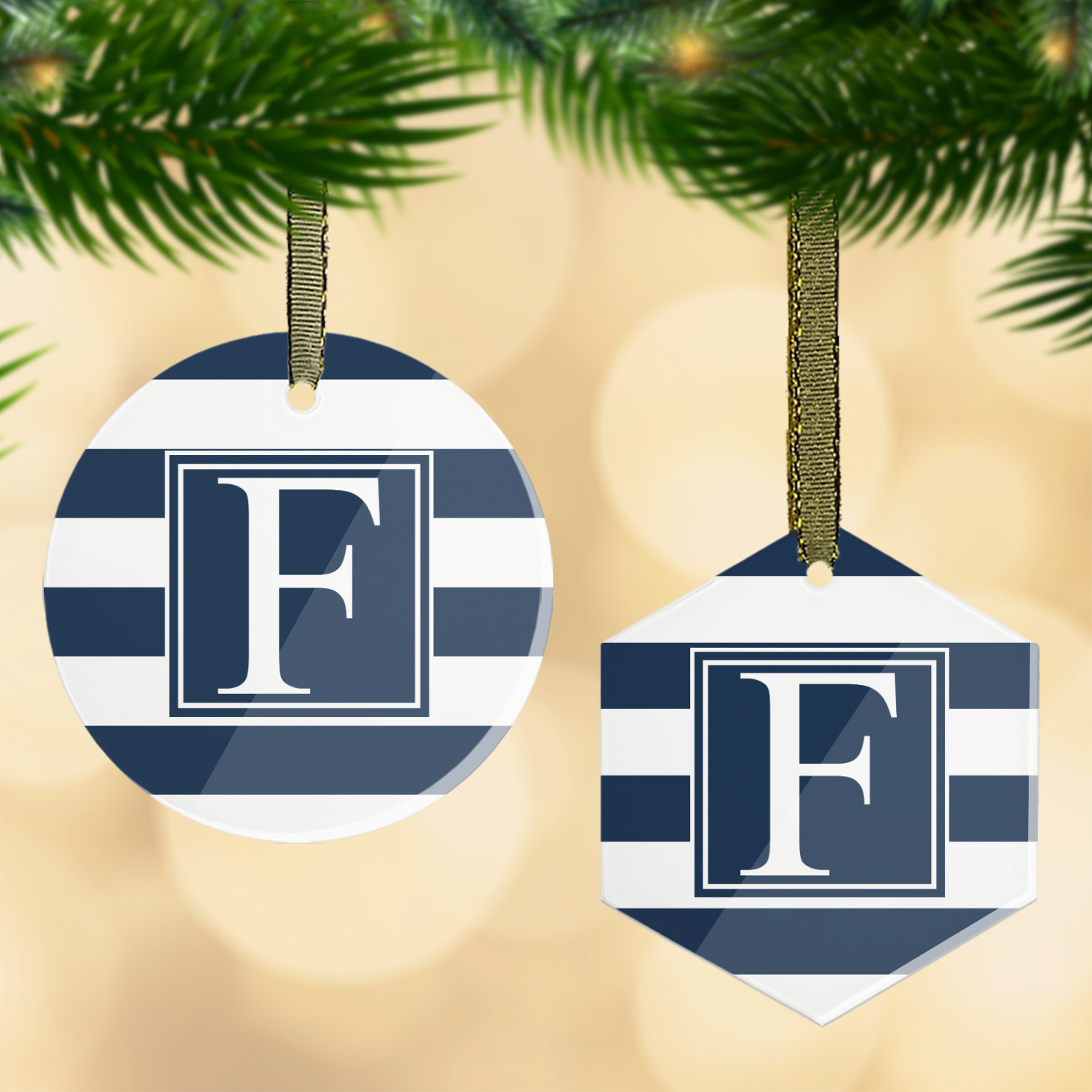 Each of our flat glass ornaments come with a gold string to hang on your Christmas tree with style! We offer two different shapes - flat, round ball or a hexagon. Both glass ornaments have a frosted coating on one side where we print your design while the other side is a clear gloss to give your personalized ornament a sheen finish. Our flat round glass ornament is approximately 3.5" x 3.5" while the flat hexagon ornaments are approximately 3.5" x 3".