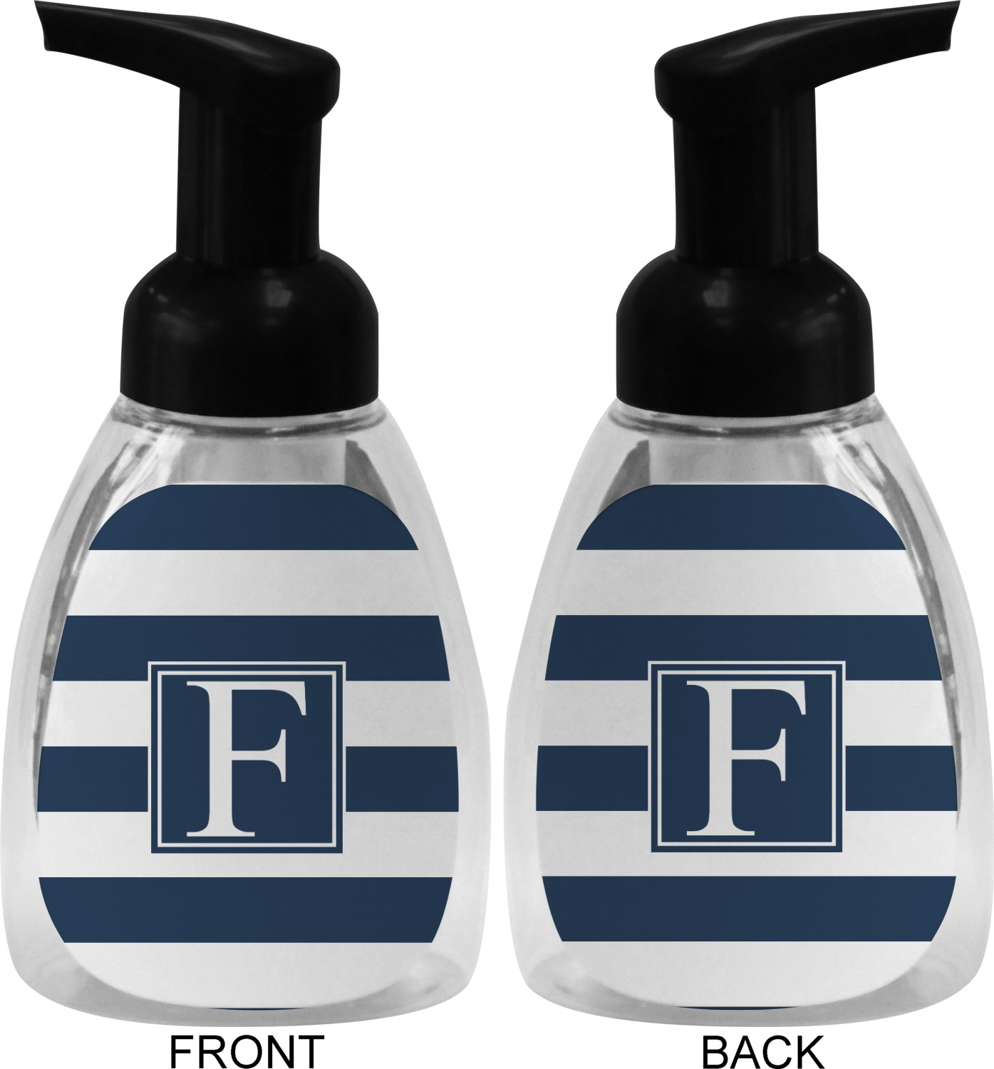 This soap dispenser is made of a robust plastic and has a clear base. The included soap pump is available in black or white color. This dispenser is 6.5 inches tall, 3 inches wide, and 2 inches deep. We display your customized designs on the front and back sides of these foaming hand soap dispensers.