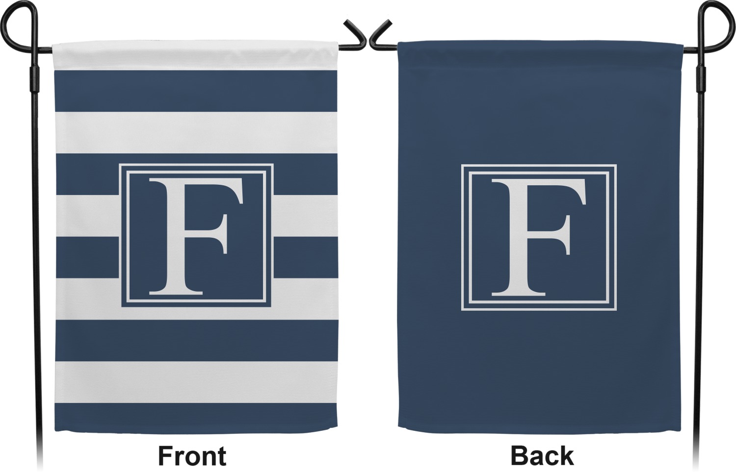 These custom garden flags are made of a durable, double-ply, polyester weave, allowing them to withstand the elements year round. The small flags measure at approximately 12 by 18 inches. The large flags measure out to 28 by 37 inches. You can order these decorative flags with your customization printed on the front only, or the front and back.