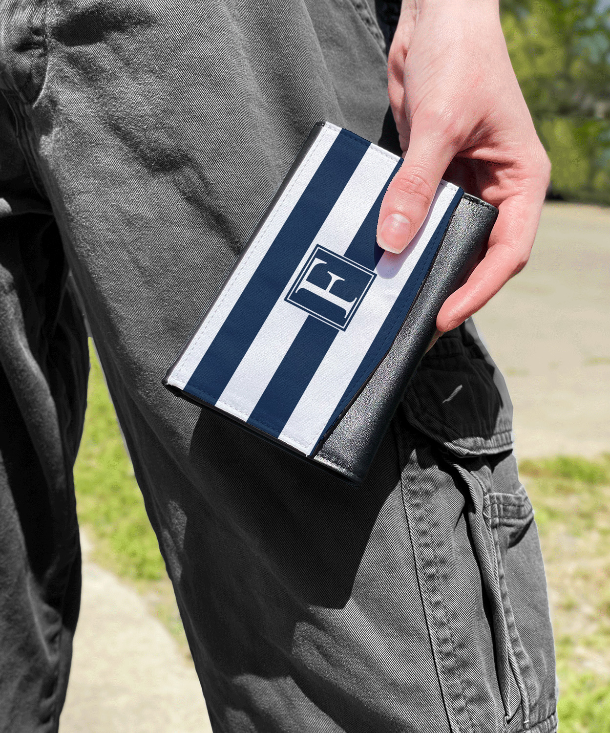 The compact size of this wallet - 5.5in wide, 3.5in tall and 0.75in thick when folded - makes it perfect to hold in hand and small enough to fit in a clutch or a normal size purse. The outside flap is customized with your choice of artwork and closes with a snap closure - with two different snaps to allow it to be adjusted when storing more items - to securely fasten the flap.