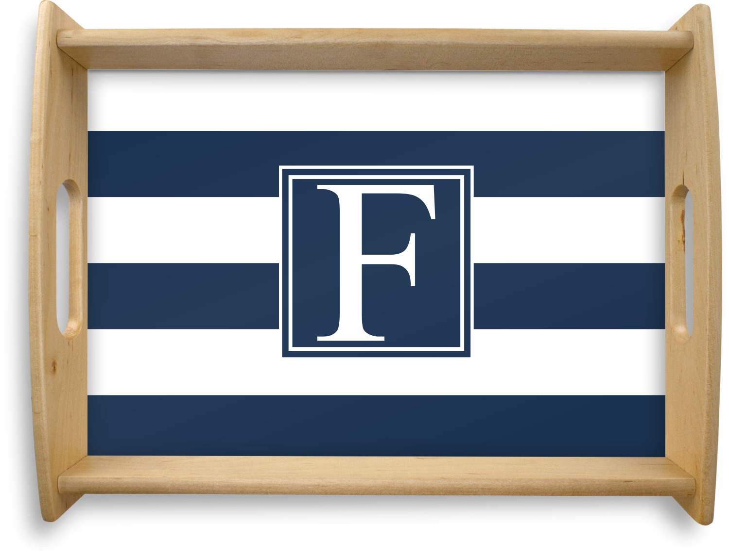This serving tray with handles features square edges and two rounded sides, creating a very modern look. Each side is fabricated from a beautifully cut, natural wood. The bottom of the interior of the tray displays your customized design in bright, vibrant color. The tray is sold in both a black color and a natural wood look. Each variation of the wood serving tray has two sizes: Small, which is 14" x 10" x 2.25", and Large, which is 19.5" x 13.5" x 2.75".