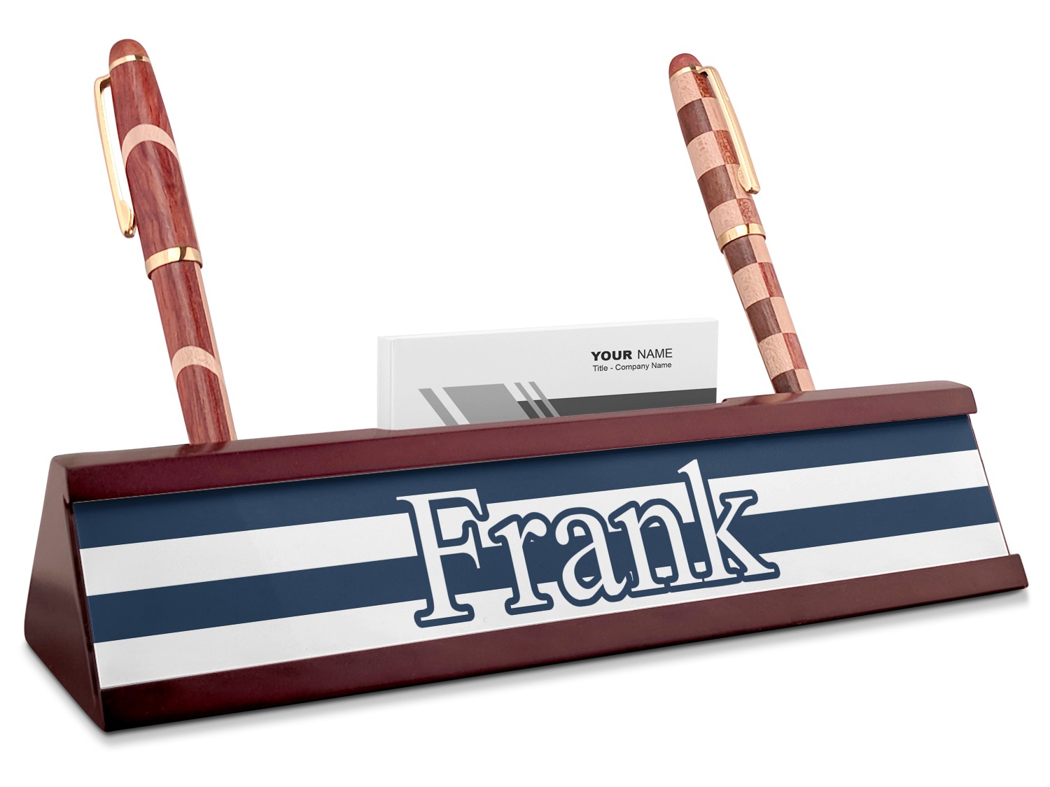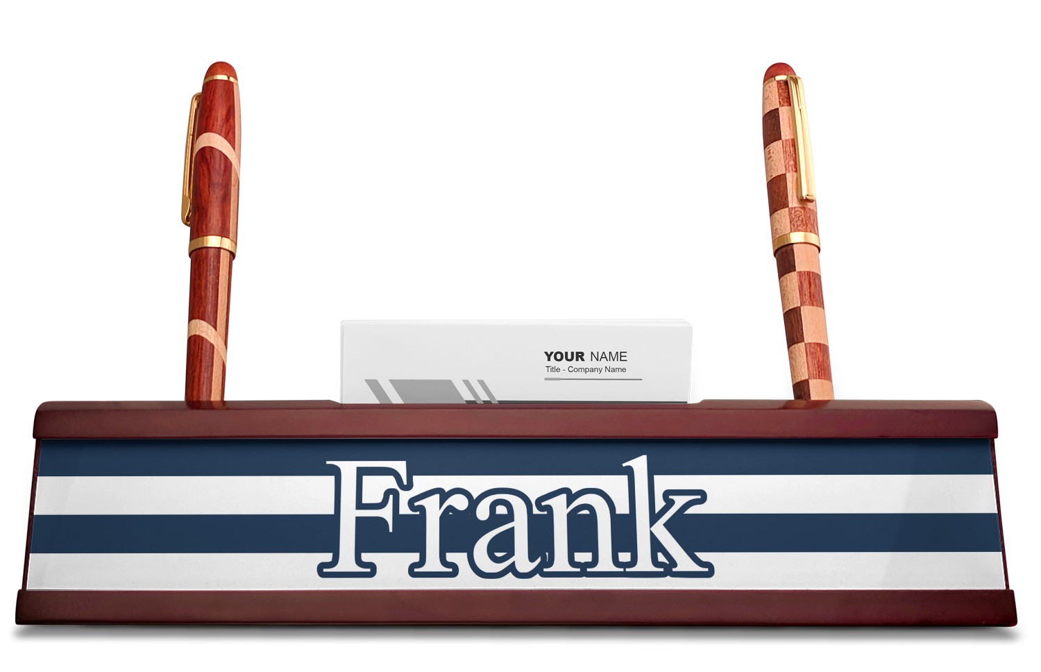 Your desk name plates are crafted from a high-quality, dark-cherry mahogany. At approximately 9.5 by 1.875 by 2.5 inches, this name plaque will fit perfectly, front and center, on your desk. Your customization spans across the entire face of the nameplate. Behind the nameplate lies a skinny slot that can fit approximately 15, traditionally-sized, business cards. You can also store your writing utensils on either side of this custom desk name plate.