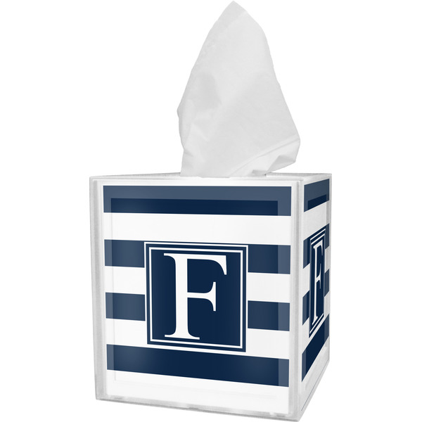 These tissue holders are built from durable acrylic and display your unique personalization on fine-quality vinyl inserts placed within the four sides and top. The box features two pieces, allowing you to easily switch out tissue boxes. On the sides, youll find ridges that ensure the top and base fit securely in place. The bottom of these tissue box holders has four, rubber, non-slip pads to prevent the box from scuffing any surface you decide to display it on. Each box can fit a standard 5 by 5-inch box of tissues.