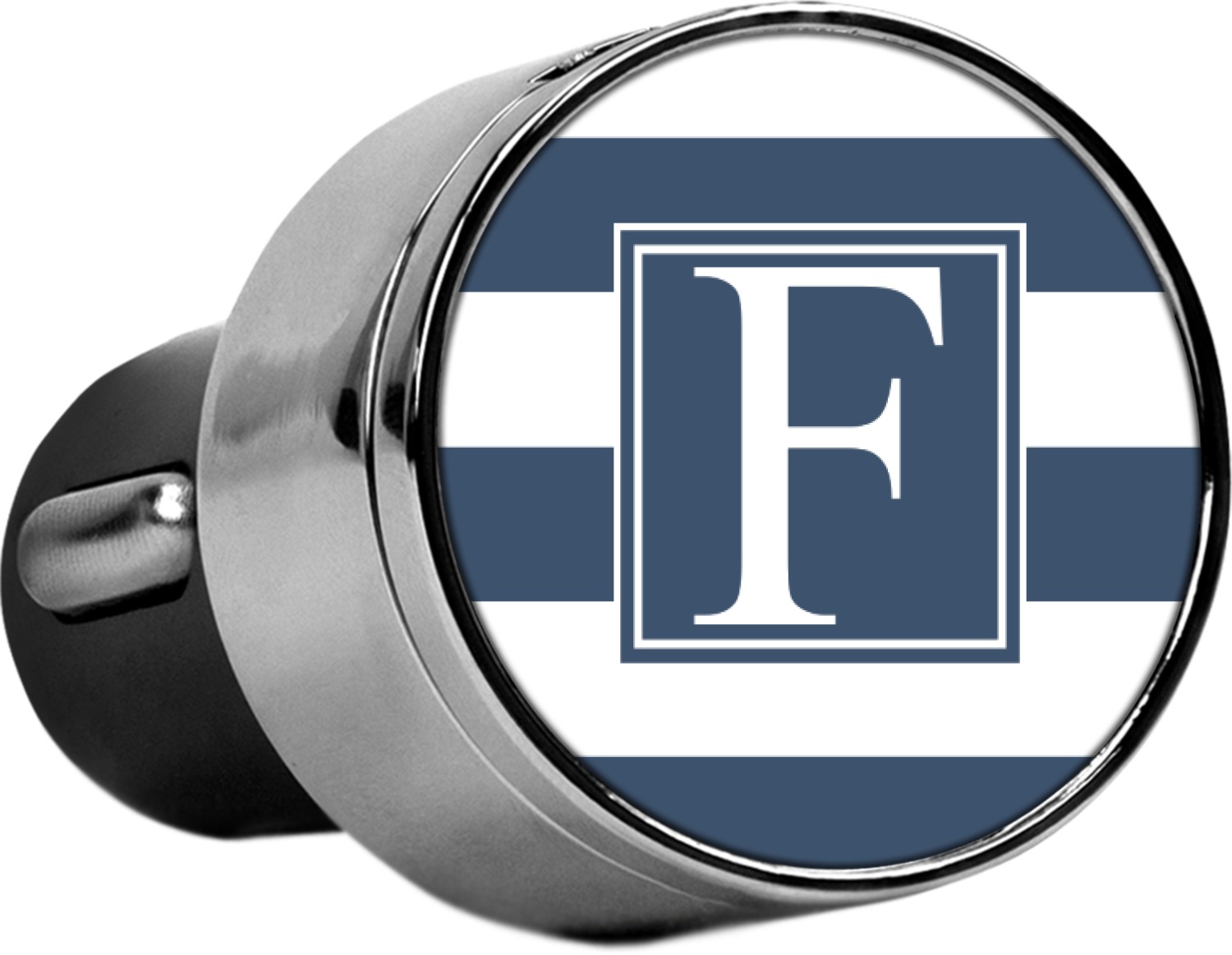 This car charger adapter converts your cars bland cigarette lighter into a decorative, personalized, and operational USB charging port. Made of solid, silver-plated metal, these chargers feature a flip-open lid that both displays your customized design and conceals two USB ports. The metal lid of the USB car charger adapter is 1.5" in diameter and seals due to a small, ingrained magnet on both the charger and its lid. The cigarette lighter insert, itself, is colored black.