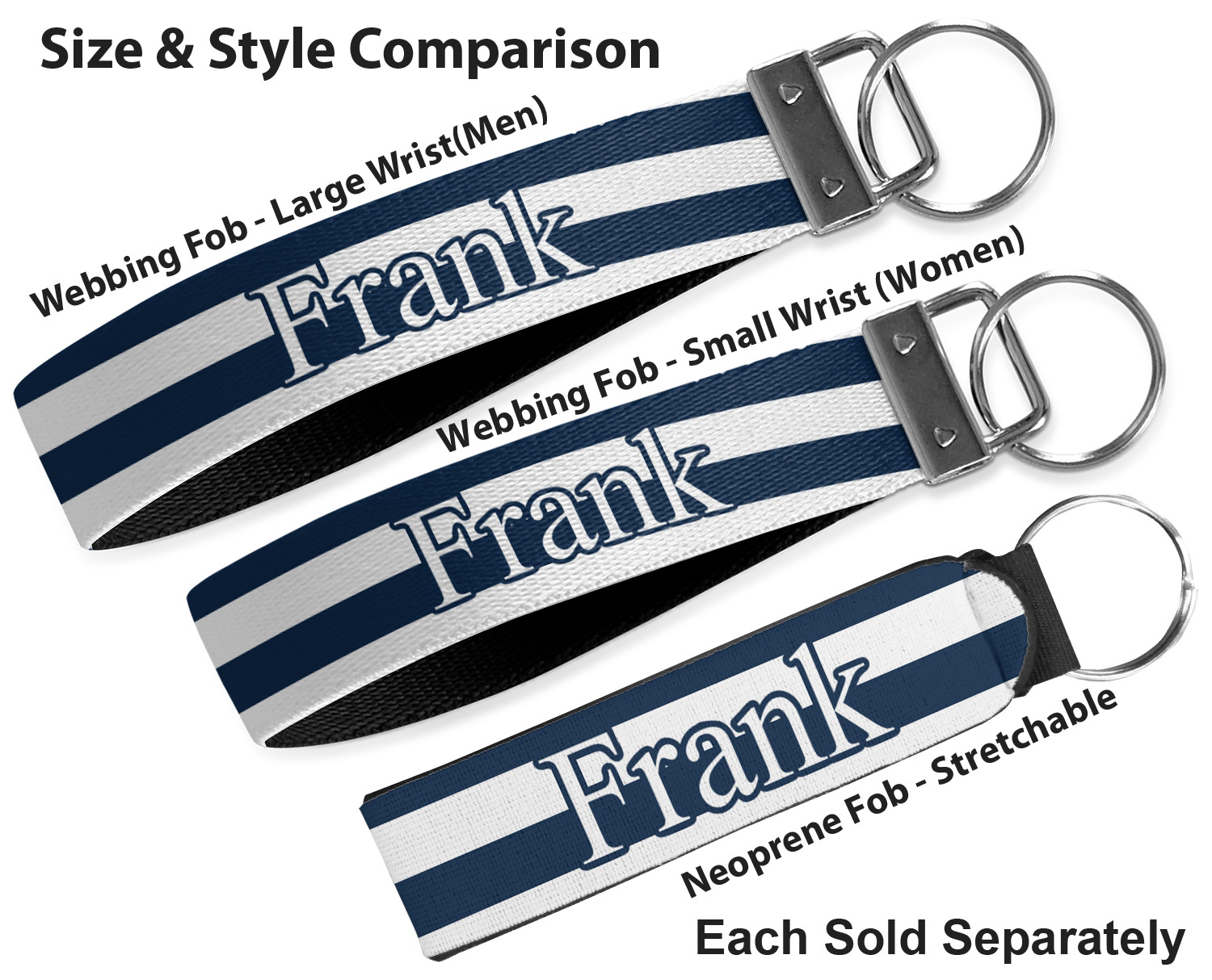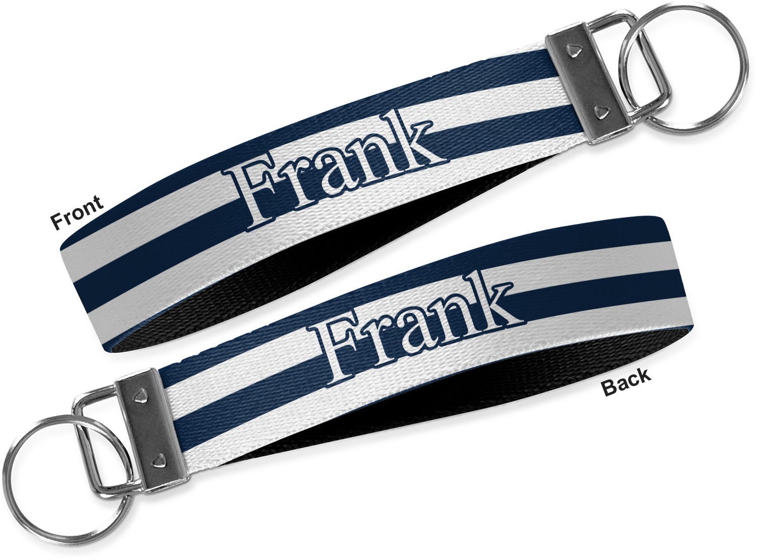 These key fob keychains are made from a polyester weave, right here in the USA. They feature a silver, metal clasp, attached to a round keyring. The piece gives the personalized wristlet a beautiful, finished look. Your customized design is printed on the outside of the keychain strap. We carry these wristlets in two sizes: small, which is 5 inches in width, and large, which is 5.5 inches in width.
