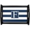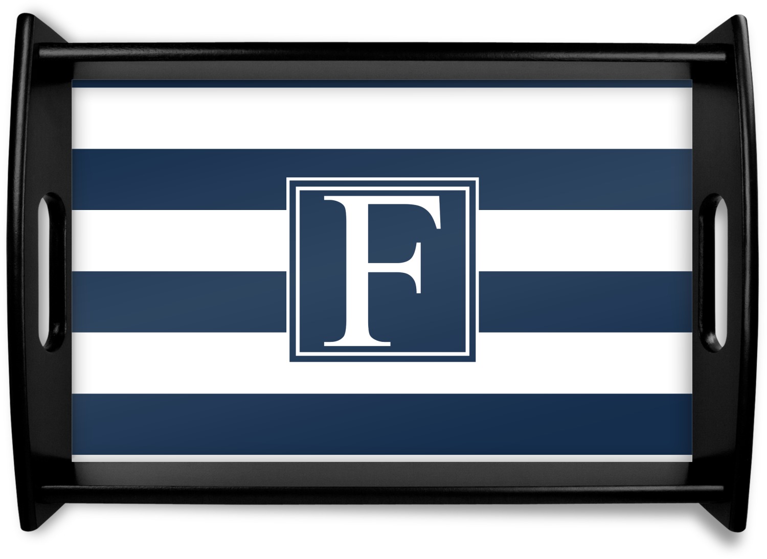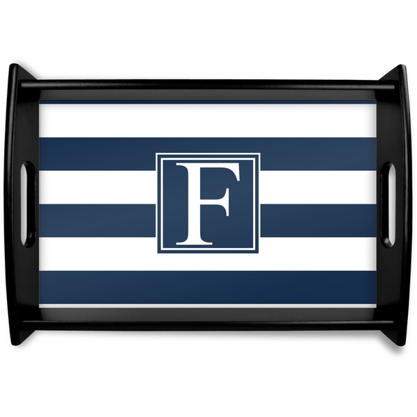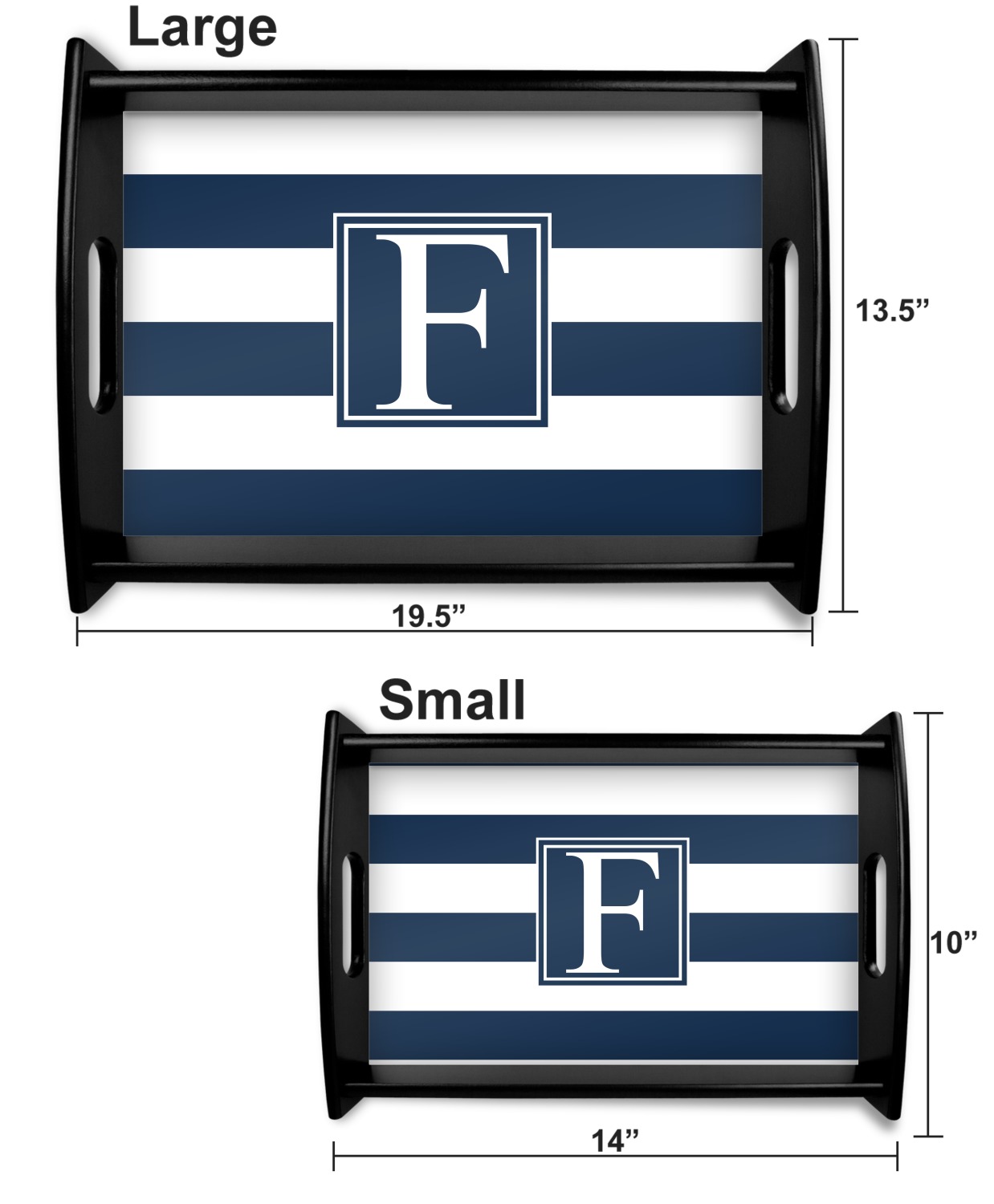 This serving tray with handles features square edges and two rounded sides, creating a very modern look. Each side is fabricated from a beautifully cut, natural wood. The bottom of the interior of the tray displays your customized design in bright, vibrant color. The tray is sold in both a black color and a natural wood look. Each variation of the wood serving tray has two sizes: Small, which is 14" x 10" x 2.25", and Large, which is 19.5" x 13.5" x 2.75".