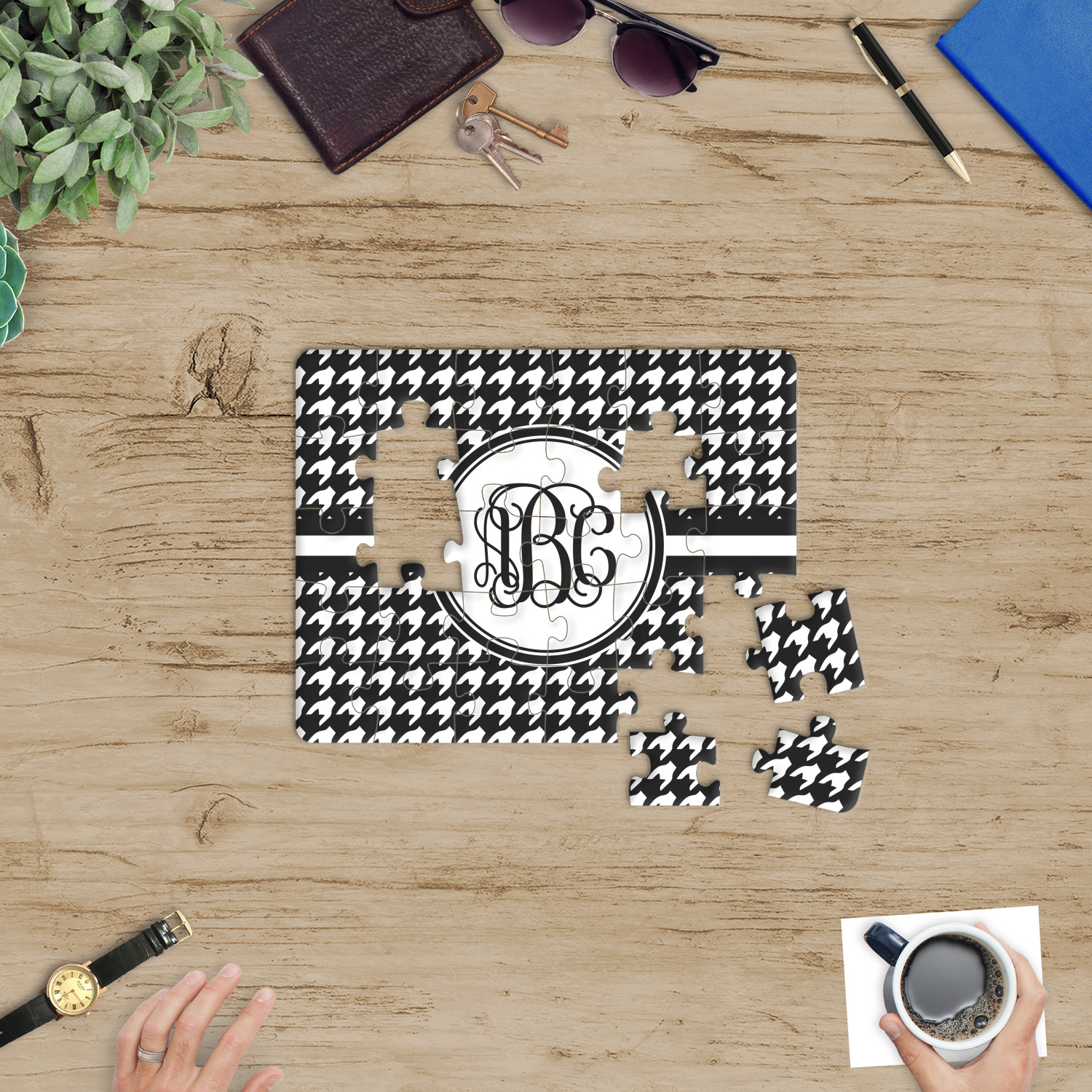 Depending on the look you are trying to achieve, you can add; a thematic pattern or background, with a photo in a frame and text or personalization to your puzzle. Basically if you can imagine it, you can design it!