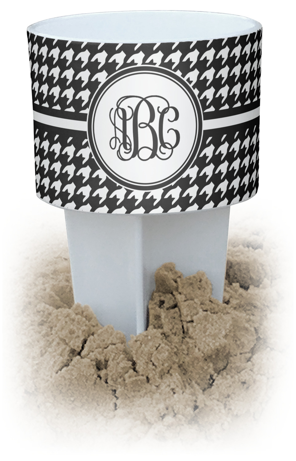 This cup holder has a large stake at its bottom that anchors it to the sand or ground below, while the cup holder rests above the stake. The entire drink holder is made of durable plastic and displays your customization around the cup holder portion. We sell these personalized beach spikers in two different colors: black and white.
