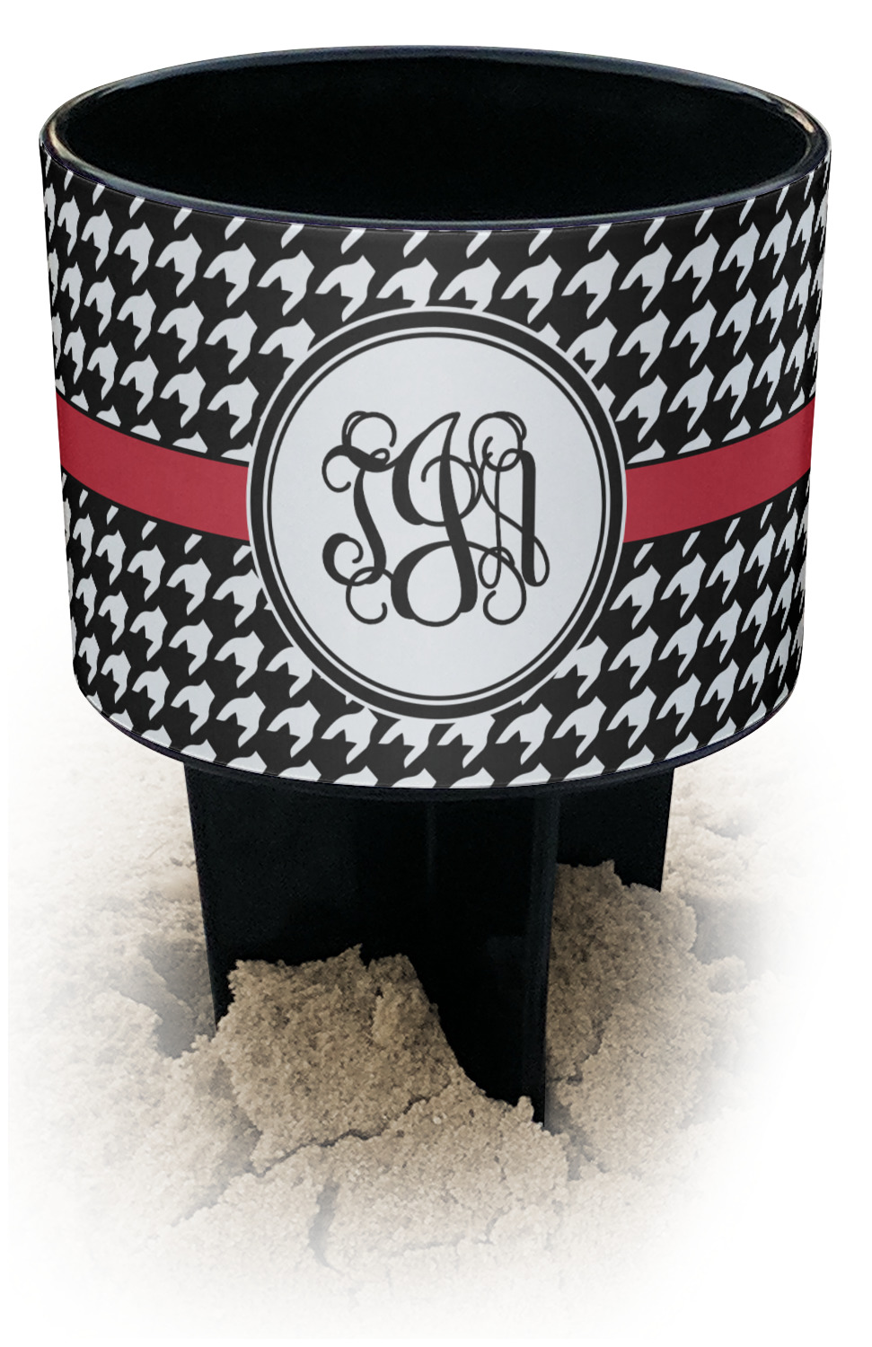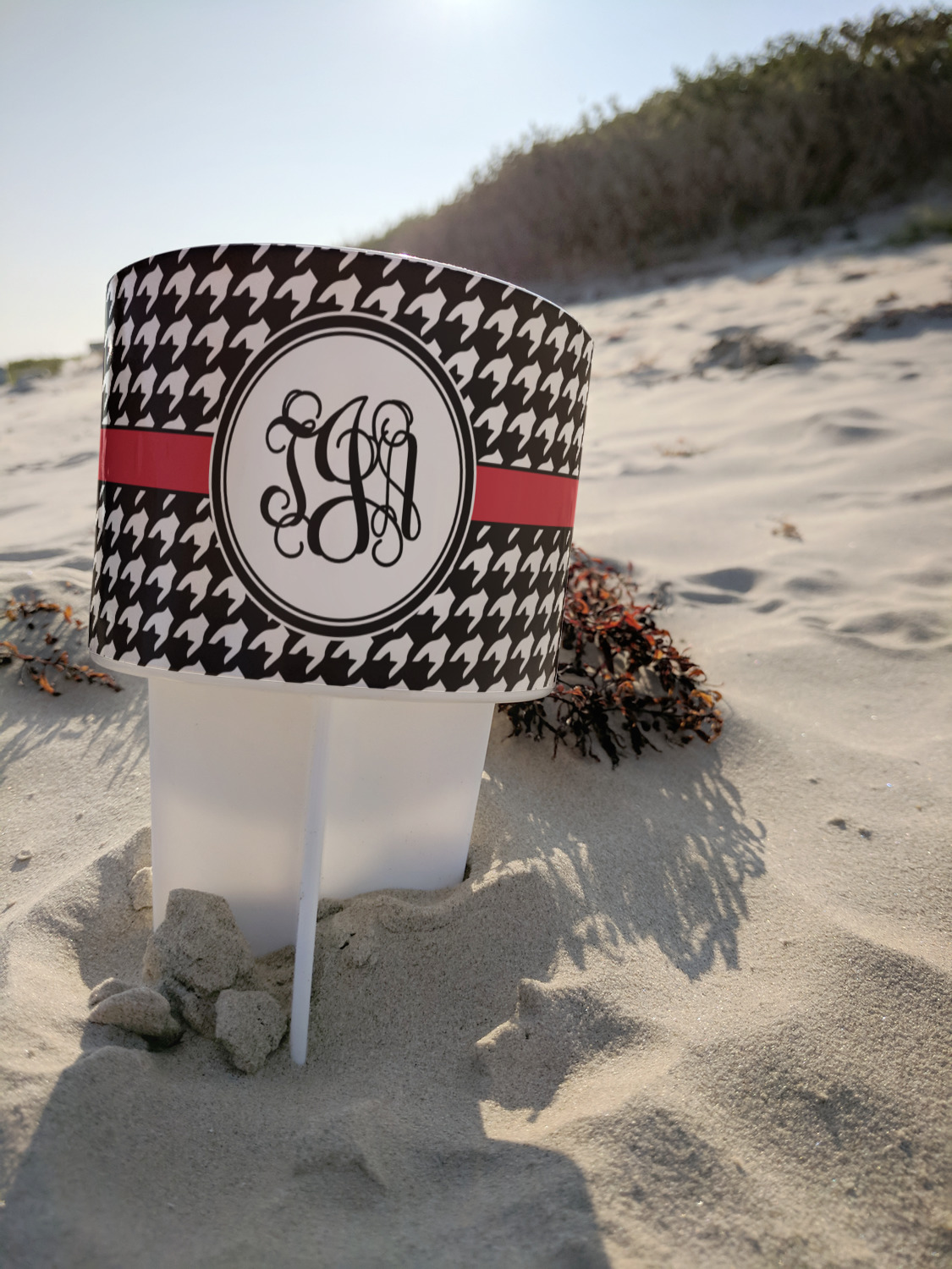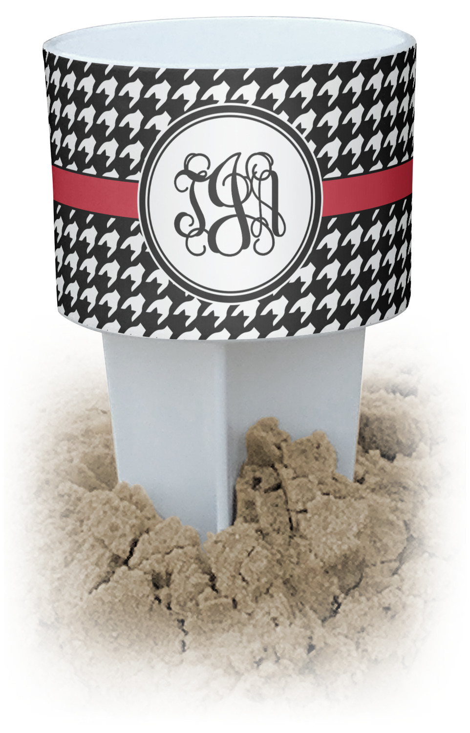 This cup holder has a large stake at its bottom that anchors it to the sand or ground below, while the cup holder rests above the stake. The entire drink holder is made of durable plastic and displays your customization around the cup holder portion. We sell these personalized beach spikers in two different colors: black and white.