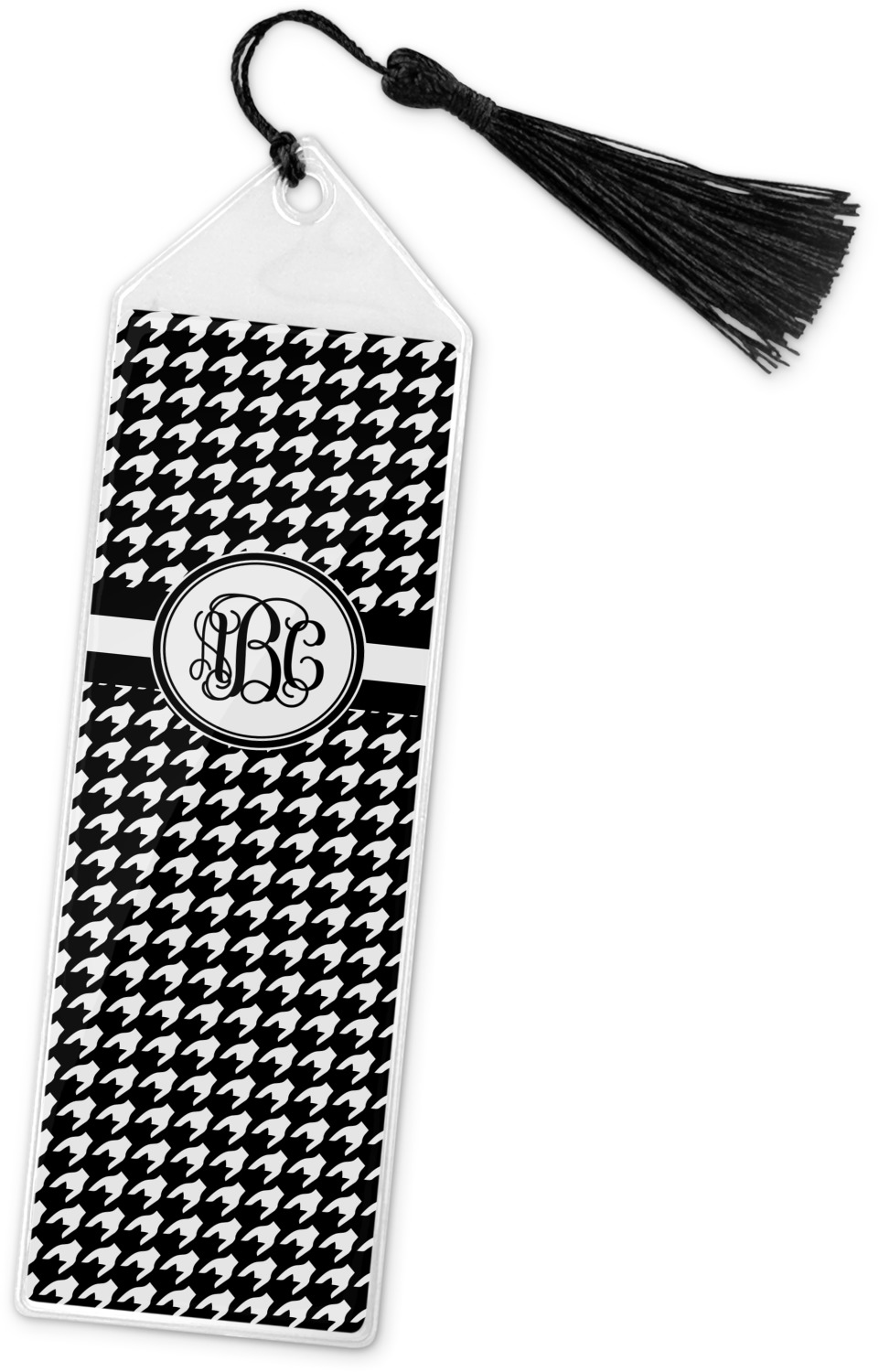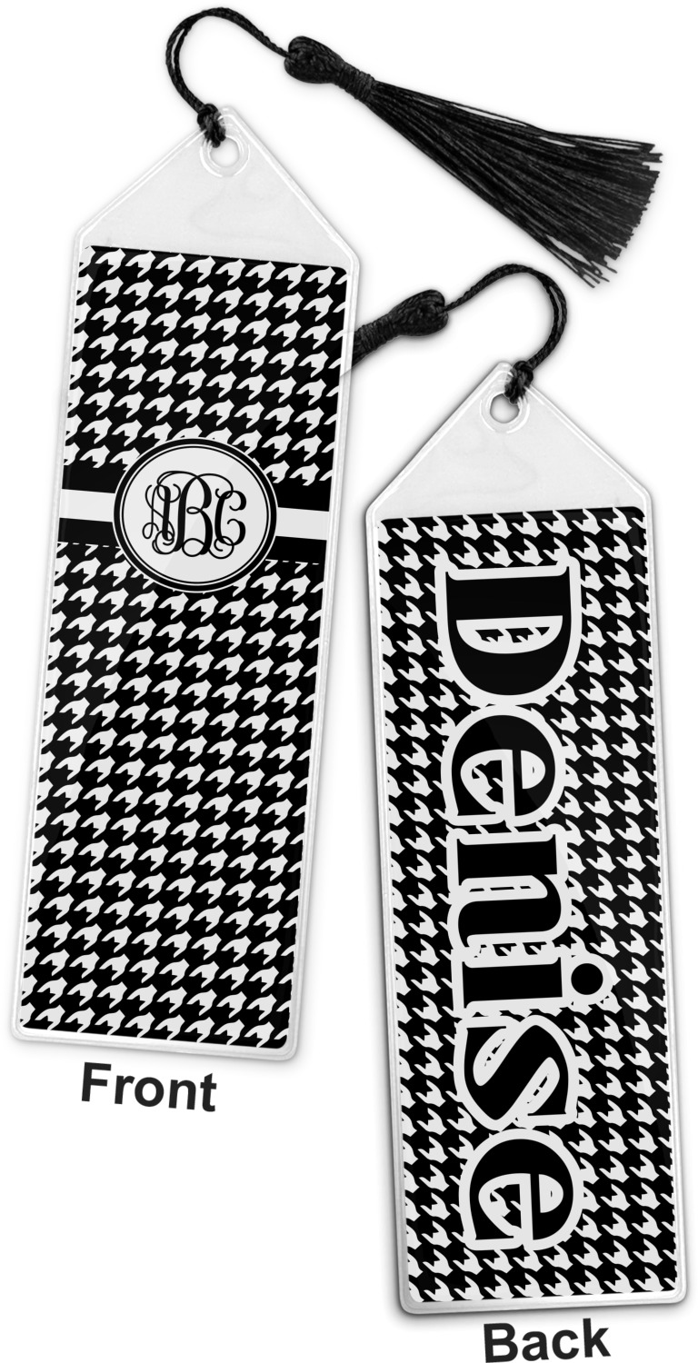 Your personalized bookmark is made of a sturdy, clear vinyl, and is approximately 7.5" x 2.25". We display your personalization on vinyl inserts that are placed on both sides. Accompanying each book marker is a black, fringe tassel that attaches to the reinforced, triangular header.