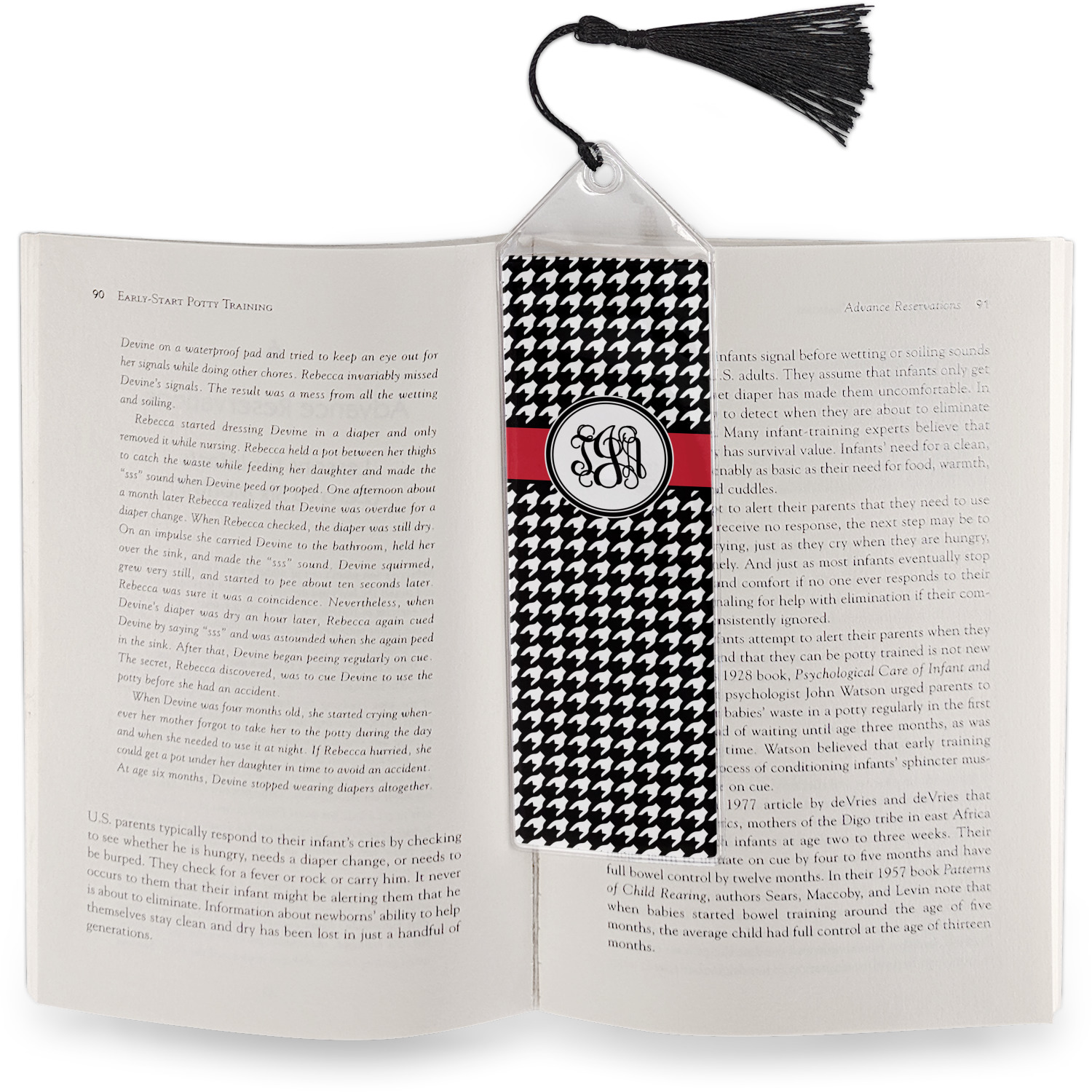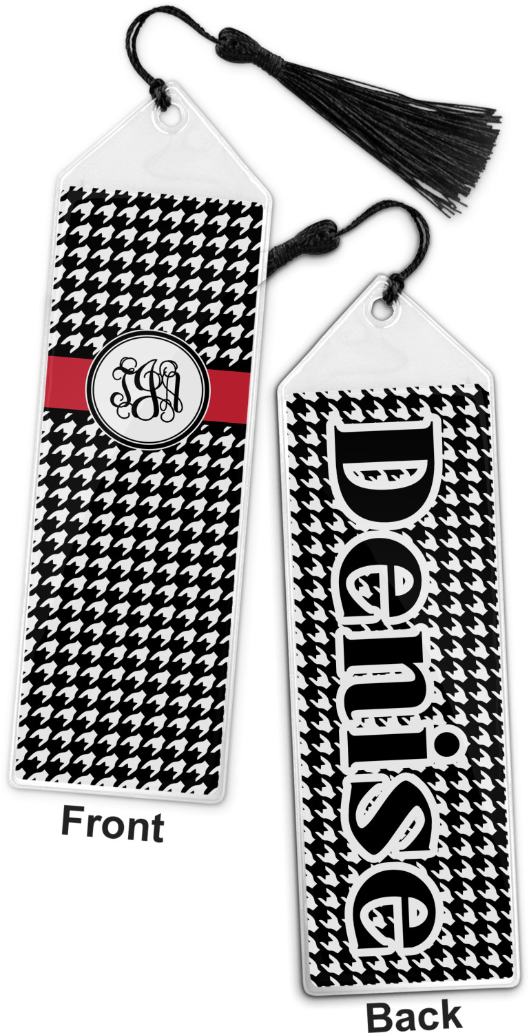 Your personalized bookmark is made of a sturdy, clear vinyl, and is approximately 7.5" x 2.25". We display your personalization on vinyl inserts that are placed on both sides. Accompanying each book marker is a black, fringe tassel that attaches to the reinforced, triangular header.