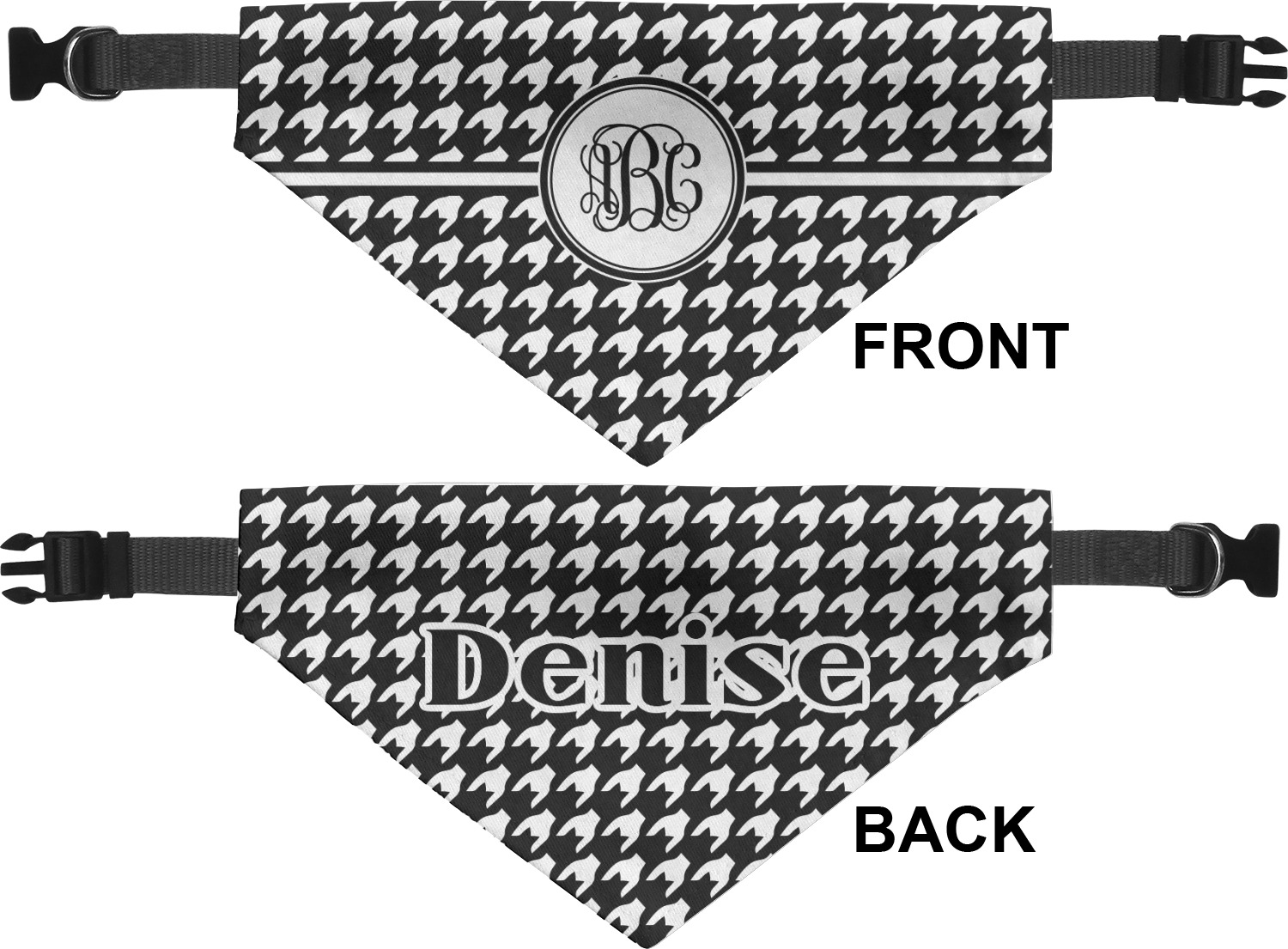 We print the front and back of these dog bandanas with your customized design. The bandana itself is made from a durable polyester, sewn together with a gap large enough to accommodate any collar. Regardless, the bandana includes a plain black, canvas collar with plastic snaps, that can easily be removed if desired. These dog bandana collars are available in four sizes: small, medium, large, and extra large. Please see our sizing chart for more information regarding the dimensions of each size.