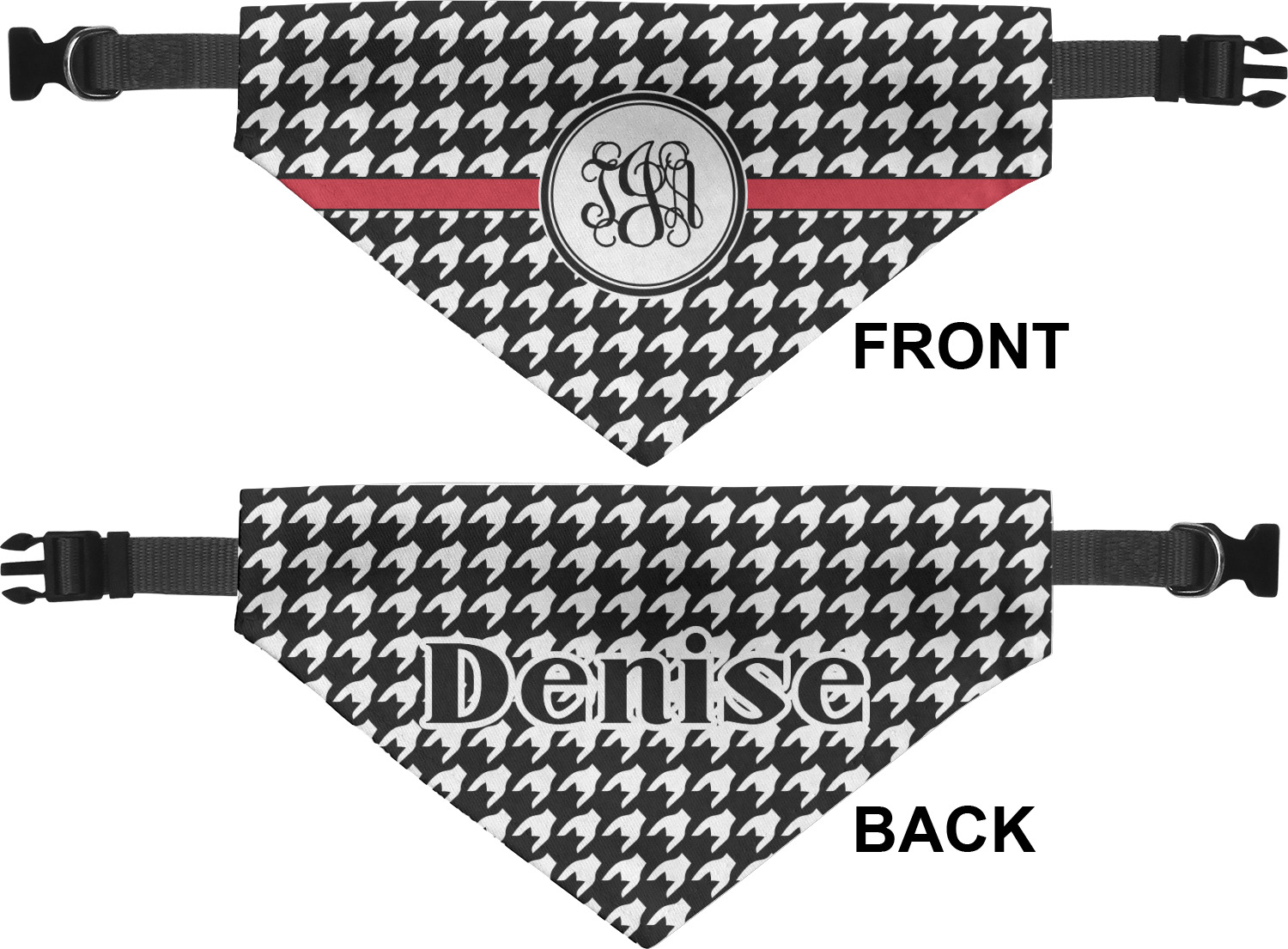 We print the front and back of these dog bandanas with your customized design. The bandana itself is made from a durable polyester, sewn together with a gap large enough to accommodate any collar. Regardless, the bandana includes a plain black, canvas collar with plastic snaps, that can easily be removed if desired. These dog bandana collars are available in four sizes: small, medium, large, and extra large. Please see our sizing chart for more information regarding the dimensions of each size.