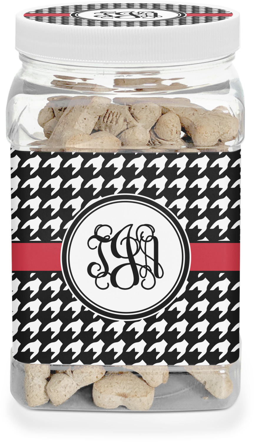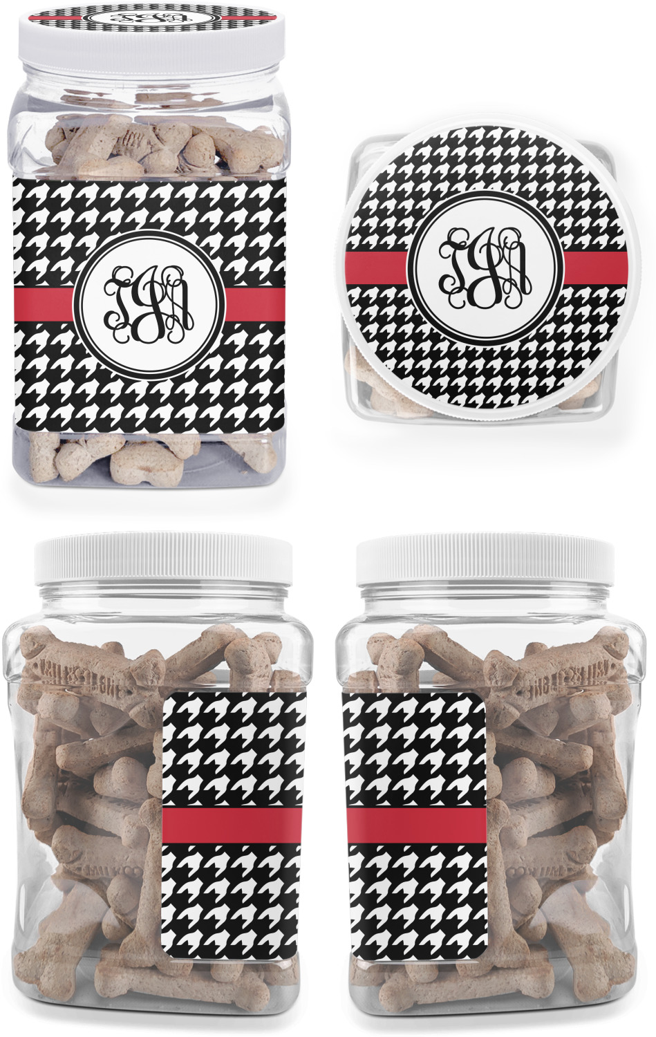 This half gallon jar, made from a sturdy plastic, is the perfect way to keep treats from any naughty pet paws, while still keeping them ready on hand for when your pup performs an impressive trick. This dog cookie jar features a screw-on, white lid that displays your personalized design on a vinyl sticker. We apply another customized sticker that wraps around the front and sides of the jar. Our dog treat jar also has indentations on the rear ends of the sides, which allows for convenient handling, and its square frame allows for easy storage.