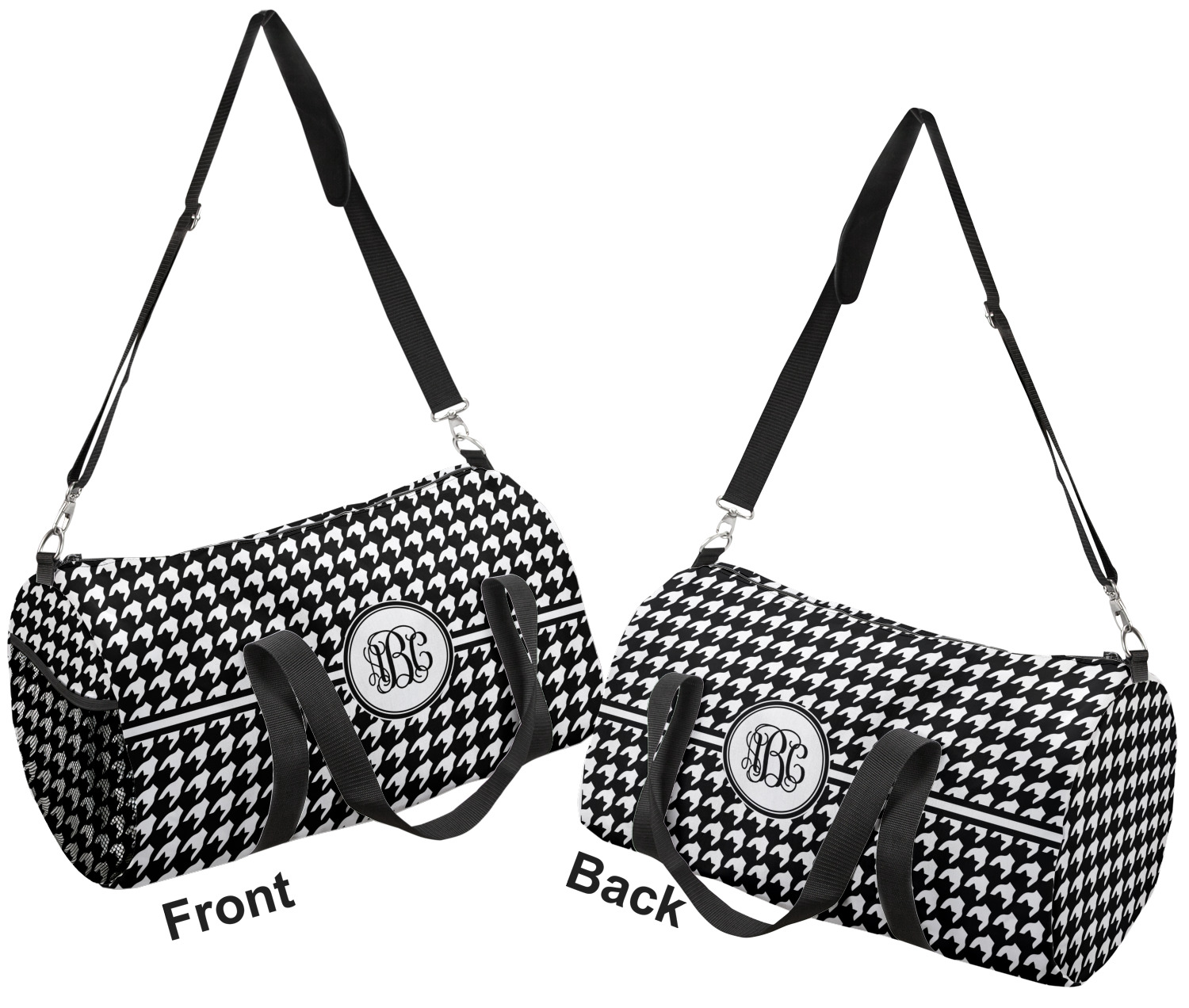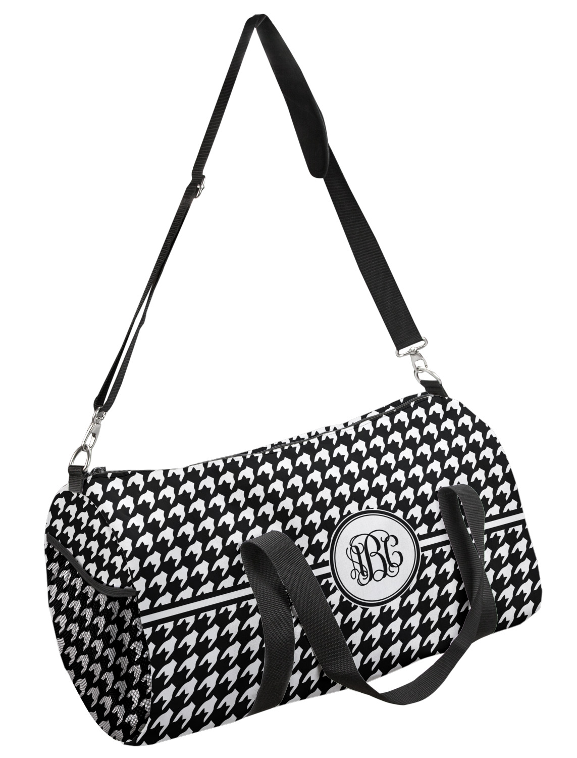 This duffle is a sturdy bag made of a canvas material. It comes in two sizes: Small (19"W x 9.5"H x 9.5"D) and Large (23"W x 12"H x 12"D). The bag is a cylindrical shape with a black adjustable strap and two handles. On one side is an elastic pouch to put a waterbottle or other small item. Your product will be sublimated with your design and is able to be designed on the front, back, and sides. Be sure to remember that the straps may cut into parts of your design if you upload your own artwork.