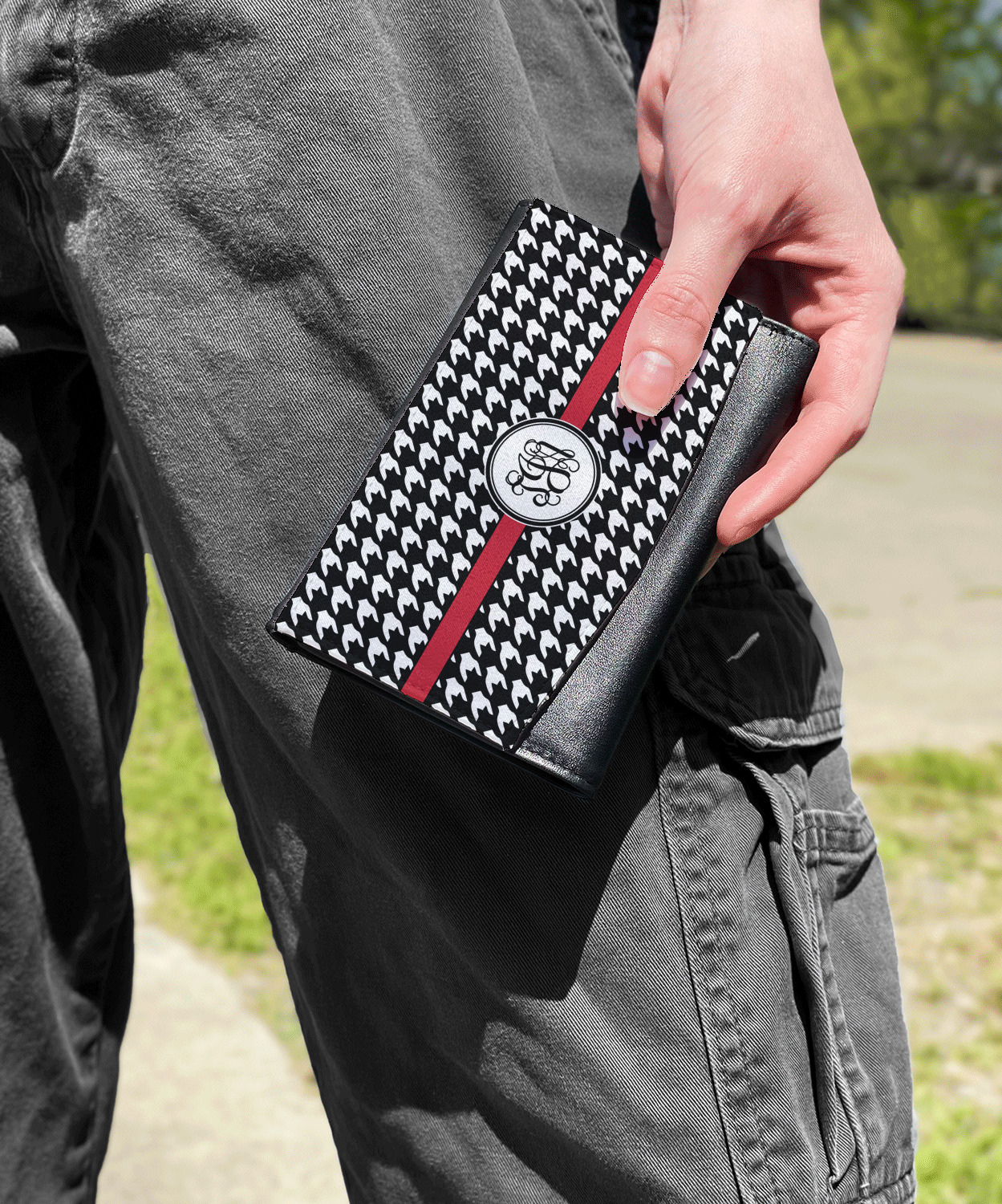 The compact size of this wallet - 5.5in wide, 3.5in tall and 0.75in thick when folded - makes it perfect to hold in hand and small enough to fit in a clutch or a normal size purse. The outside flap is customized with your choice of artwork and closes with a snap closure - with two different snaps to allow it to be adjusted when storing more items - to securely fasten the flap.