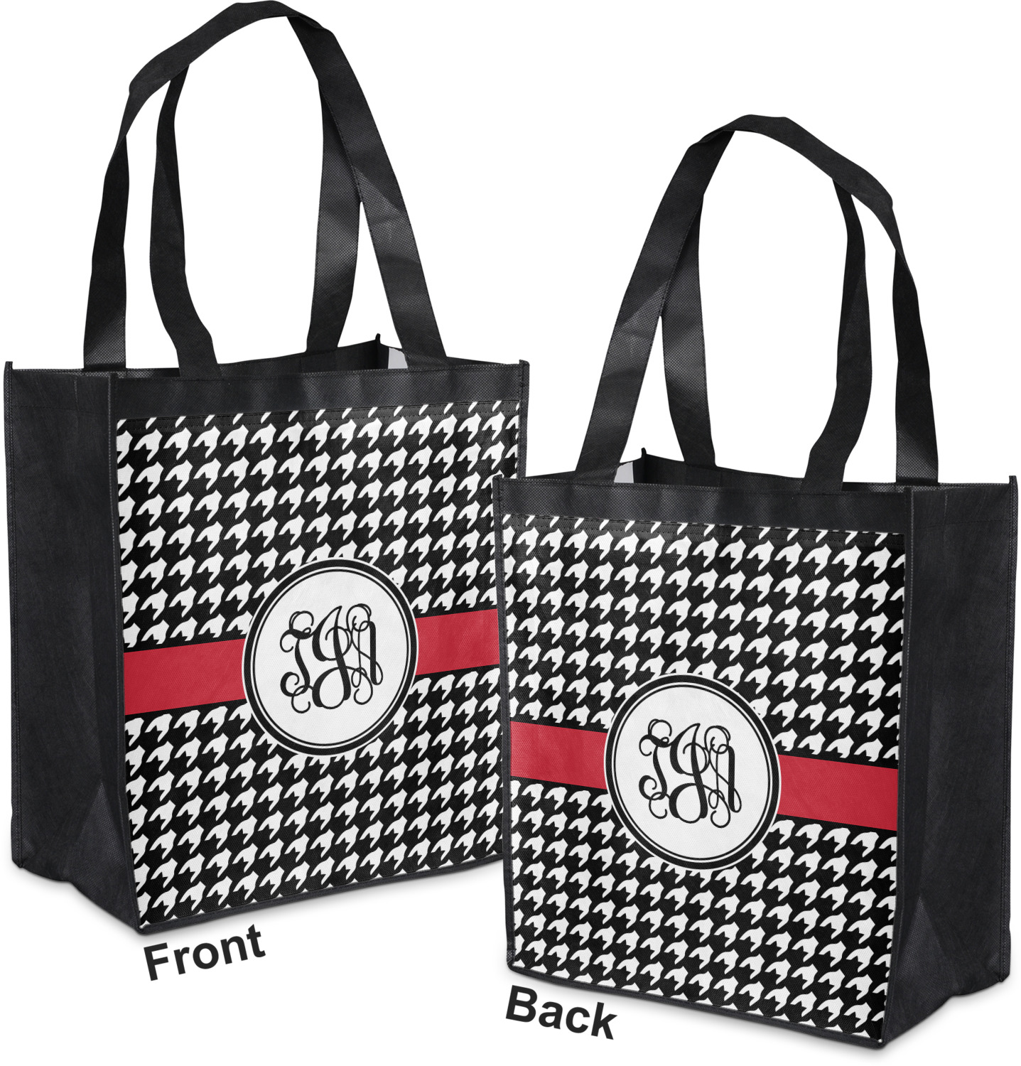 Made from a durable, biodegradable material, these reusable shopping bags can support up to 30 pounds of weight. With two large handles, measuring at 8.5 inches each, these personalized tote bags are easy to carry to your vehicle or home. The bag itself is 12 by 13.5 inches, and can expand to a depth of 7 inches. Your customization is printed on both the front and back, while the remaining sides, trim, and handle are a sleek, charcoal black.
