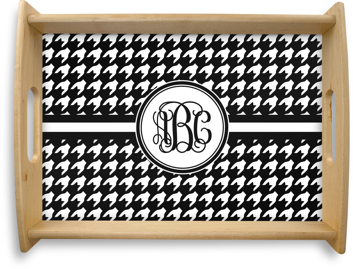 This serving tray with handles features square edges and two rounded sides, creating a very modern look. Each side is fabricated from a beautifully cut, natural wood. The bottom of the interior of the tray displays your customized design in bright, vibrant color. The tray is sold in both a black color and a natural wood look. Each variation of the wood serving tray has two sizes: Small, which is 14" x 10" x 2.25", and Large, which is 19.5" x 13.5" x 2.75".