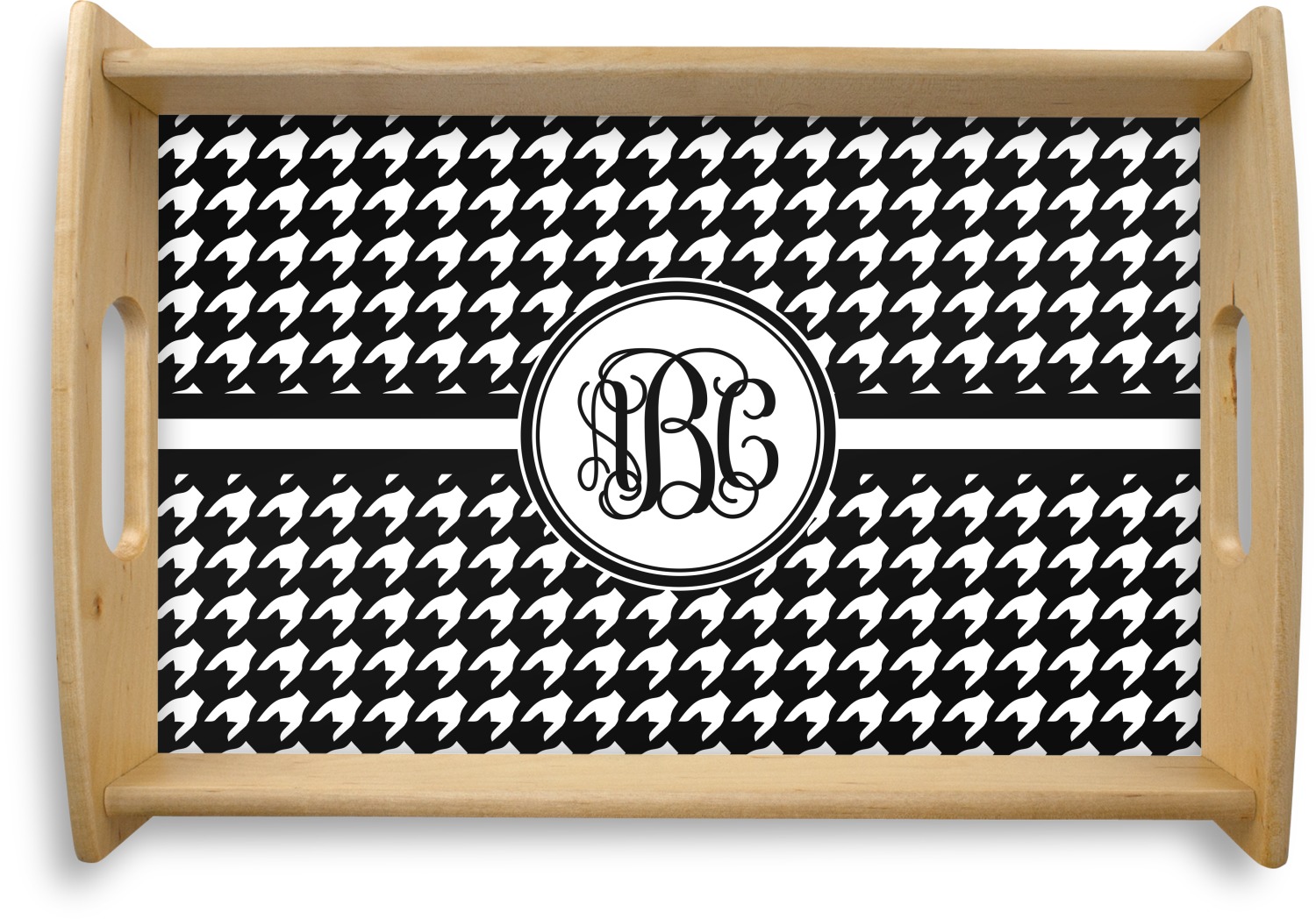 This serving tray with handles features square edges and two rounded sides, creating a very modern look. Each side is fabricated from a beautifully cut, natural wood. The bottom of the interior of the tray displays your customized design in bright, vibrant color. The tray is sold in both a black color and a natural wood look. Each variation of the wood serving tray has two sizes: Small, which is 14" x 10" x 2.25", and Large, which is 19.5" x 13.5" x 2.75".