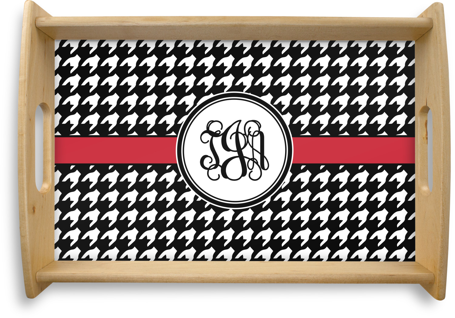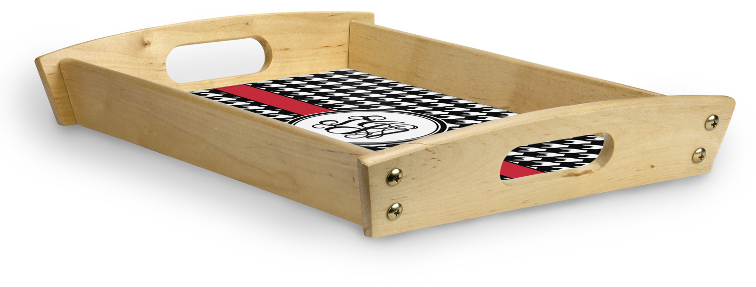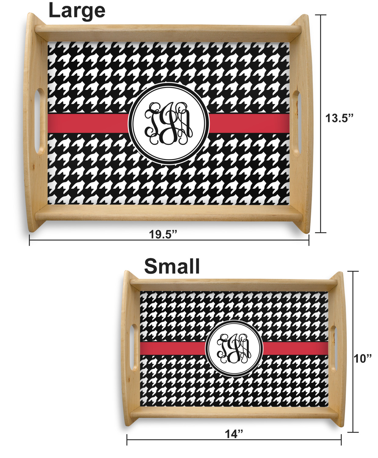 This serving tray with handles features square edges and two rounded sides, creating a very modern look. Each side is fabricated from a beautifully cut, natural wood. The bottom of the interior of the tray displays your customized design in bright, vibrant color. The tray is sold in both a black color and a natural wood look. Each variation of the wood serving tray has two sizes: Small, which is 14" x 10" x 2.25", and Large, which is 19.5" x 13.5" x 2.75".