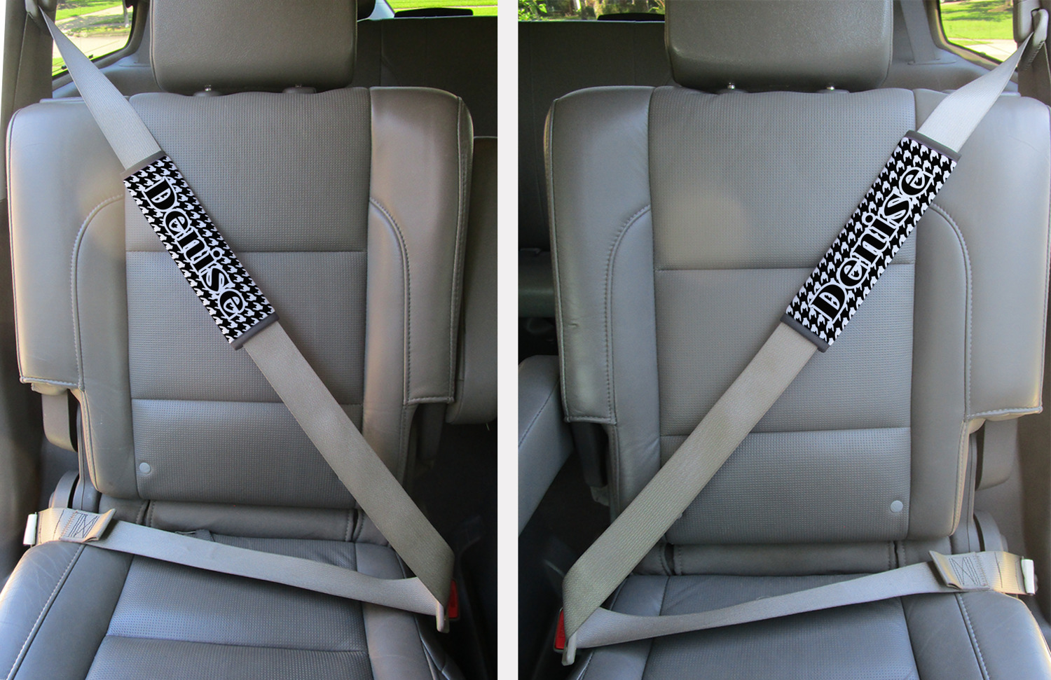 Made from neoprene, our seat belt strap covers wrap around the belt itself and have a Velcro tab for easy attachment and closure. The belt's edges are trimmed with a black polyester for a secure finish. Each cover is 9.5 by 7 inches when open and 9.5 by 2.5 inches when closed. We print your personalized design on the face of the seat belt pad.