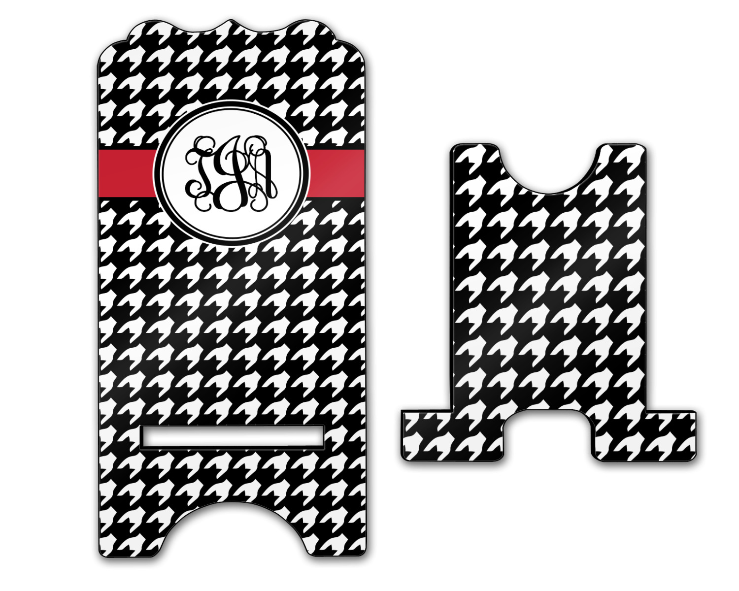 To meet your needs, we offer four variations of this IPhone stand. The backboard of the first version is shaped as a plain, yet sleek rectangle, and is available in two sizes. Our smaller size is approximately 4 by 3.25 by 7 inches, while the larger model is 4 by 3.77 by 8.5 inches. Alongside this model, we also provide you with a more decorative option. The upper part of our second version features a curved edge, for a classy, suave appearance. This phone holder is also sold in two sizes: a smaller version, which is 4 by 3.25 by 7 inches, and our larger model, which is 4 by 3.77 by 8.5 inches. Both models will support large phones, but the larger model is better if you wish to proudly display your personalized design.