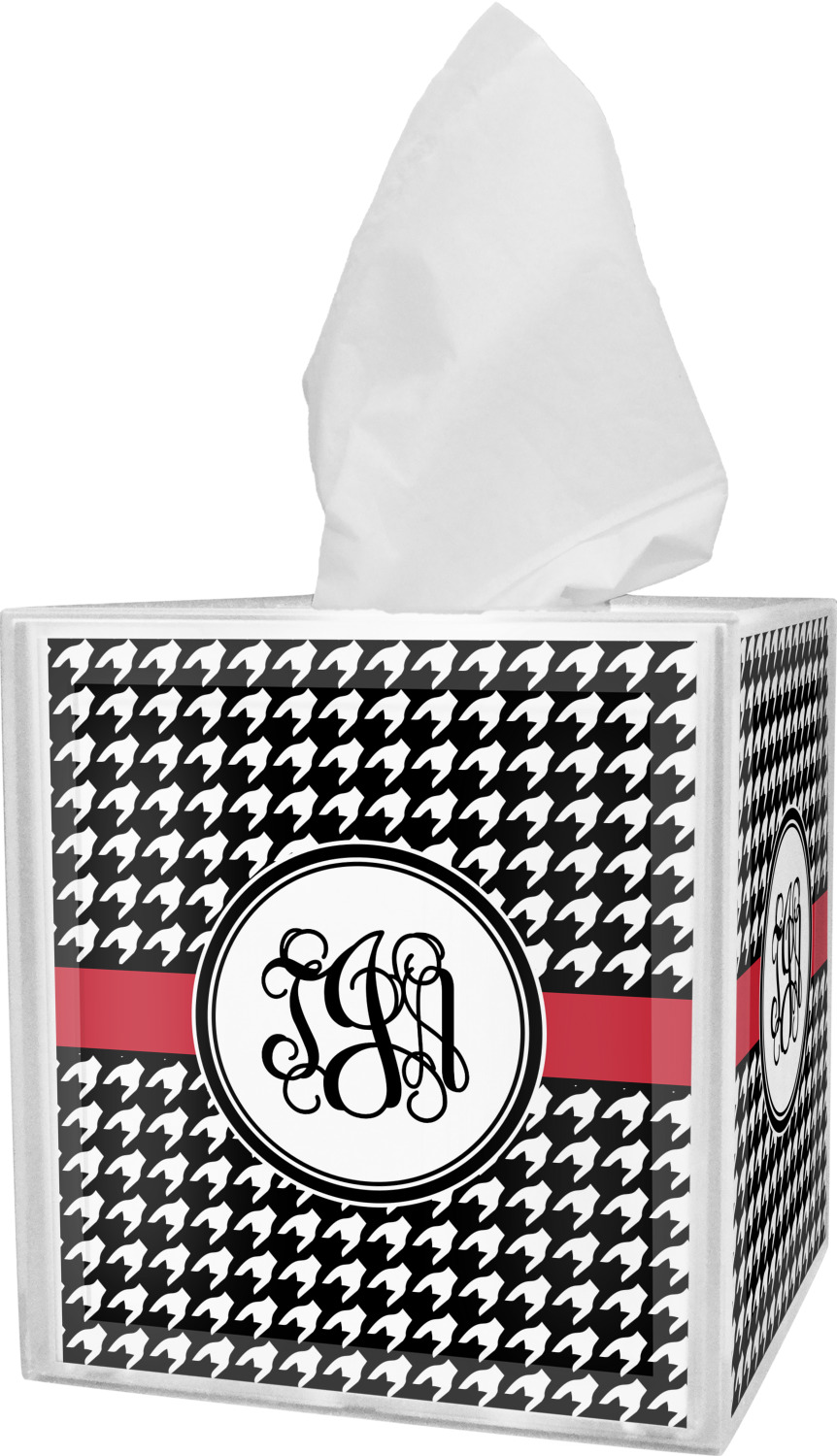 These tissue holders are built from durable acrylic and display your unique personalization on fine-quality vinyl inserts placed within the four sides and top. The box features two pieces, allowing you to easily switch out tissue boxes. On the sides, youll find ridges that ensure the top and base fit securely in place. The bottom of these tissue box holders has four, rubber, non-slip pads to prevent the box from scuffing any surface you decide to display it on. Each box can fit a standard 5 by 5-inch box of tissues.