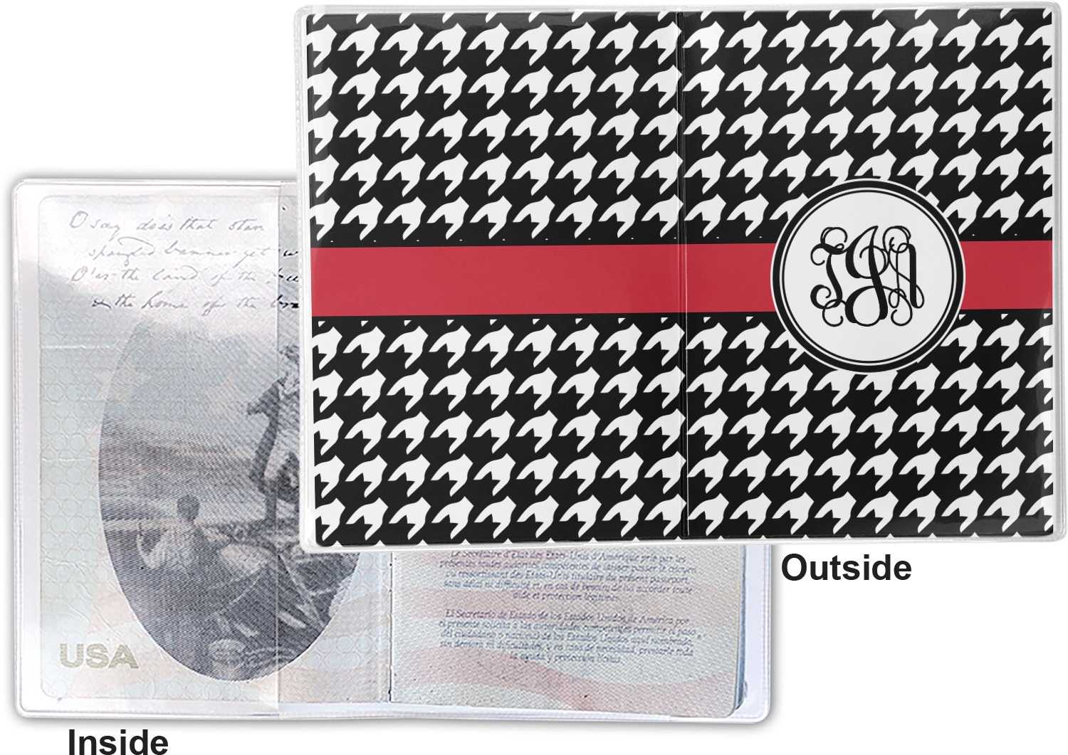 This cover is made of a sturdy clear vinyl with a personalized vinyl insert inside. There is a large and a small pocket on either side to hold the covers of your passport easily and firmly. The passport holder is approximately 7.5" x 5.25", the perfect size to snugly fit your passport. This slim cover is the perfect way to protect your passport without being one more bulky item you have to carry.