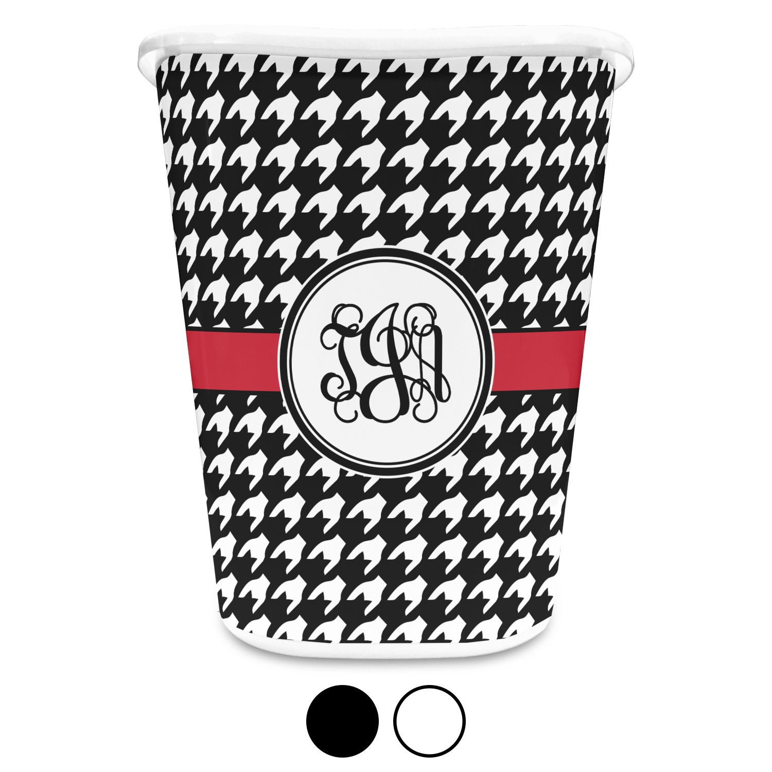 You can choose to purchase these decorative wastebaskets in either a white or a black color that will show on the base and the upper rim. Your customization is printed on a high-gloss, fine-quality vinyl adhesive, and you can choose to either have this adhesive applied to one side only or to both sides. As such, this plastic wastebasket can be single-sided or double-sided, depending on your creative vision. Your customization is printed using durable inks, making the design waterproof and resistant to fading over time.