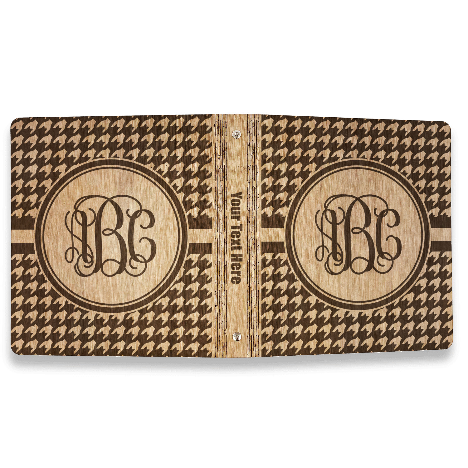 Made from premium hardwood, these are laser engraved then polished with wax to give a nice sheen and smooth feel to the product. The inside of the binders are finished with a faux leather material which is bonded to the inside of the wood to strengthen the wood and give the inside the same refined finish. The rustic brown and gold leather material adds a nice classic touch to the binders.