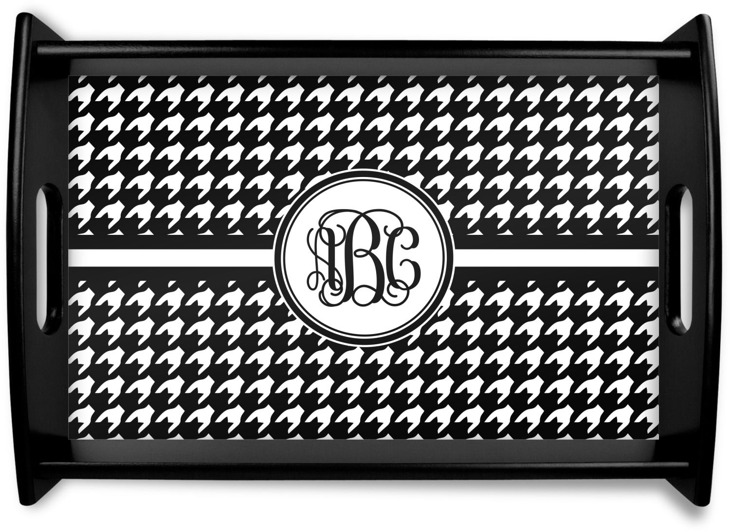 This serving tray with handles features square edges and two rounded sides, creating a very modern look. Each side is fabricated from a beautifully cut, natural wood. The bottom of the interior of the tray displays your customized design in bright, vibrant color. The tray is sold in both a black color and a natural wood look. Each variation of the wood serving tray has two sizes: Small, which is 14" x 10" x 2.25", and Large, which is 19.5" x 13.5" x 2.75".
