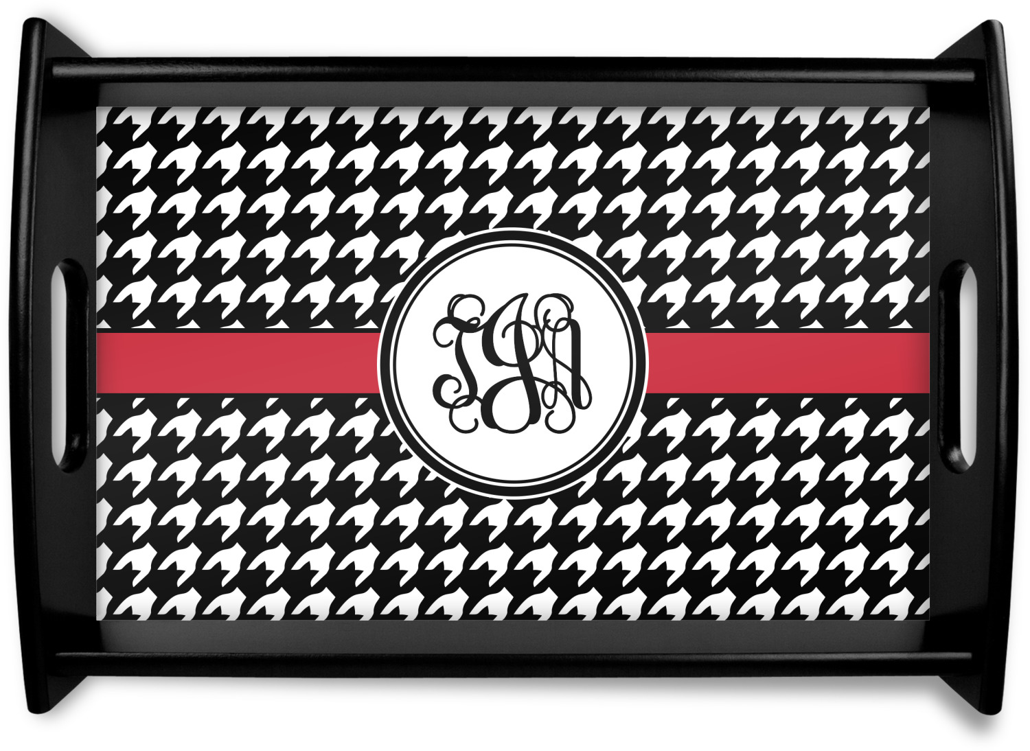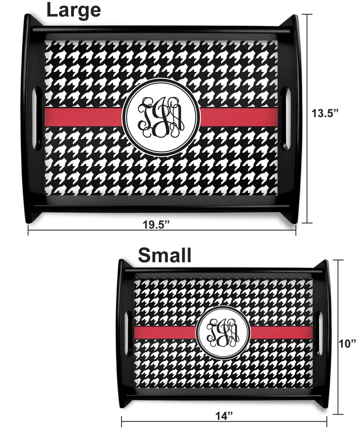 This serving tray with handles features square edges and two rounded sides, creating a very modern look. Each side is fabricated from a beautifully cut, natural wood. The bottom of the interior of the tray displays your customized design in bright, vibrant color. The tray is sold in both a black color and a natural wood look. Each variation of the wood serving tray has two sizes: Small, which is 14" x 10" x 2.25", and Large, which is 19.5" x 13.5" x 2.75".