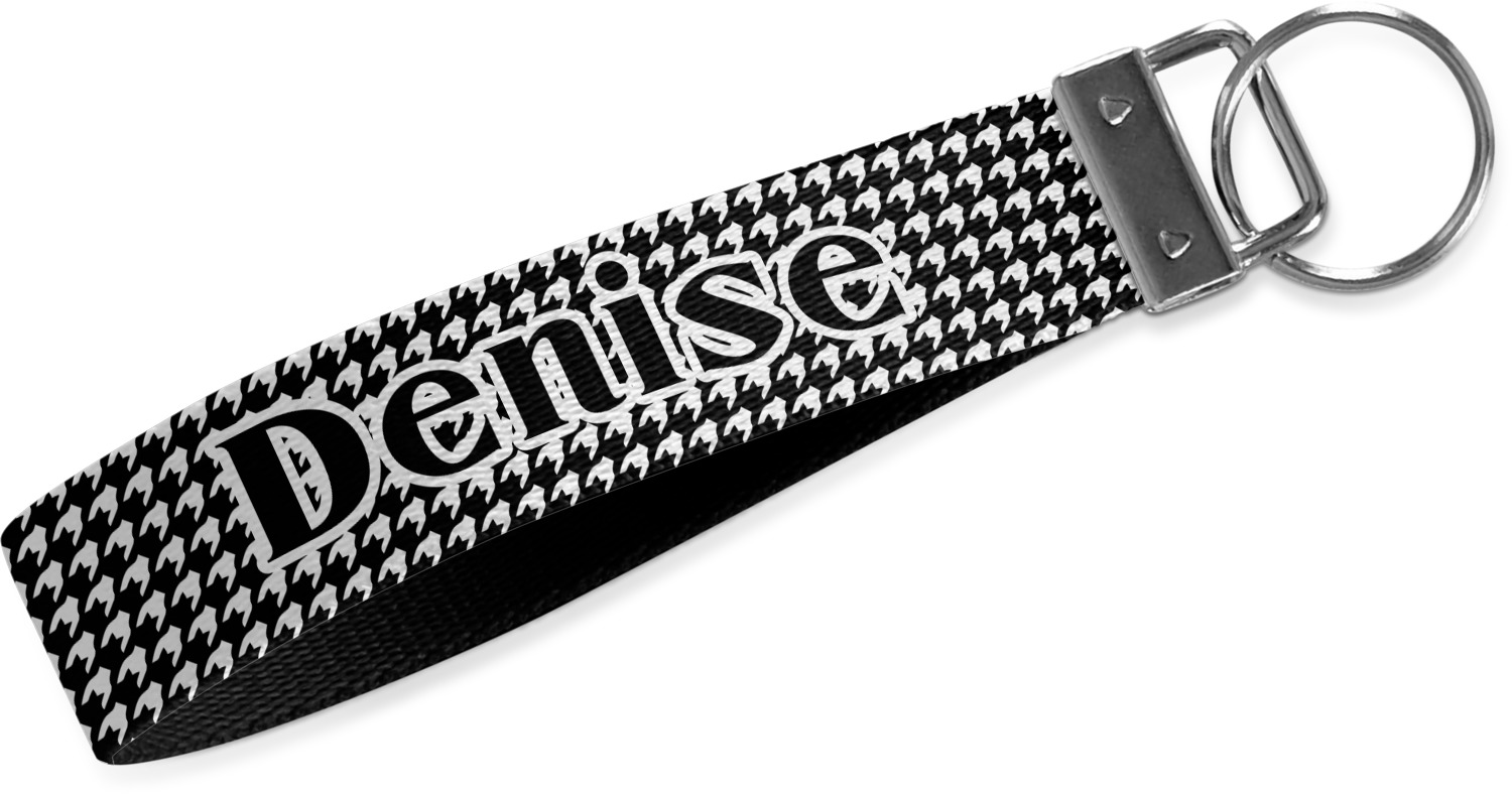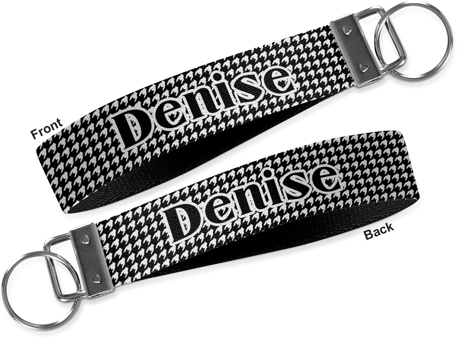 These key fob keychains are made from a polyester weave, right here in the USA. They feature a silver, metal clasp, attached to a round keyring. The piece gives the personalized wristlet a beautiful, finished look. Your customized design is printed on the outside of the keychain strap. We carry these wristlets in two sizes: small, which is 5 inches in width, and large, which is 5.5 inches in width.