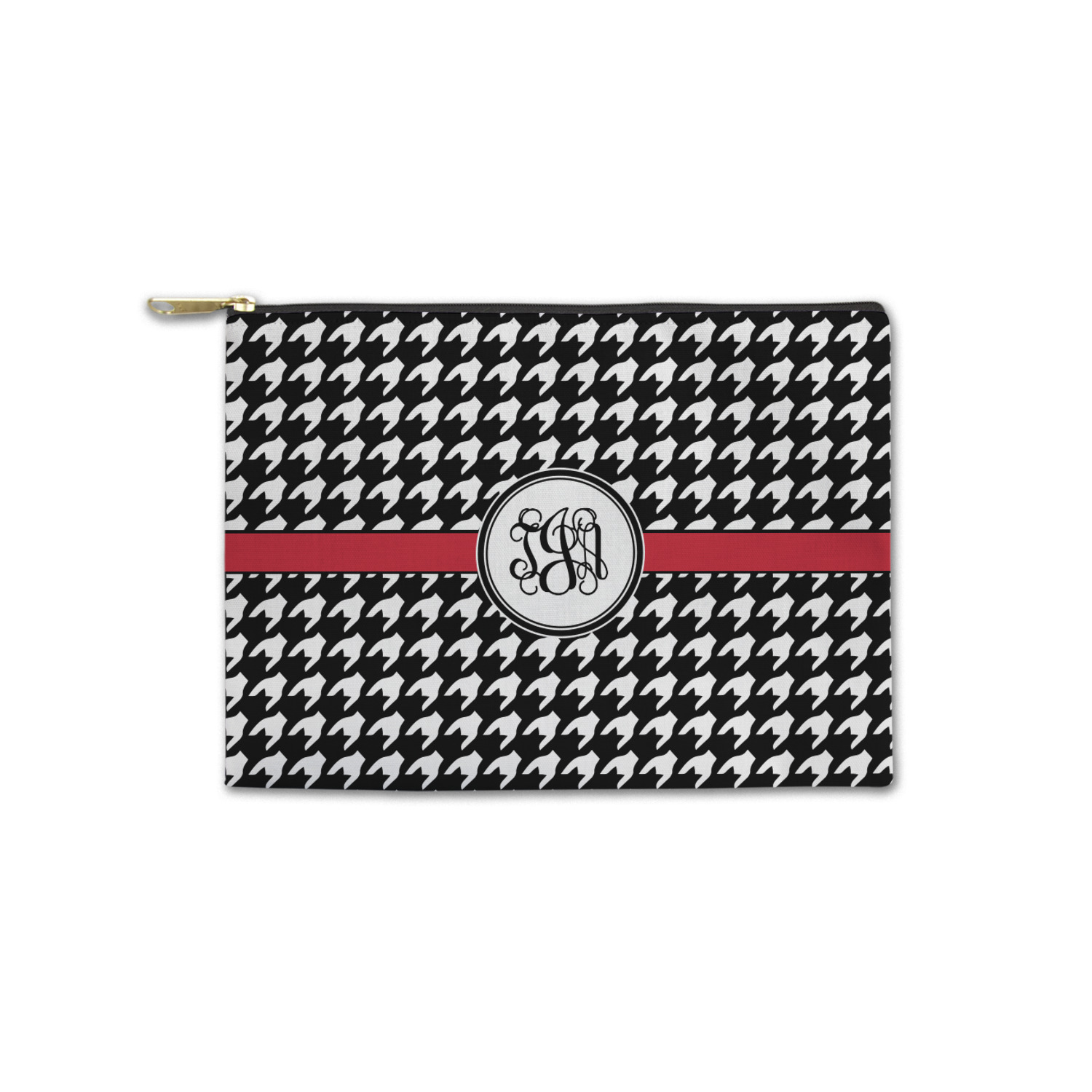 Our zippered pouches are available in two sizes - small: approx 8.5W"x6H and large: approx 12.5Wx8.5H. The pouches are made from a soft & durable canvas fabric that is printed on the outside with your design; the inside has a fused black lining. The printed canvas fabric is then cut and the pouches are sewn right here in the USA. The zipper itself is gold in color and has a round hook.