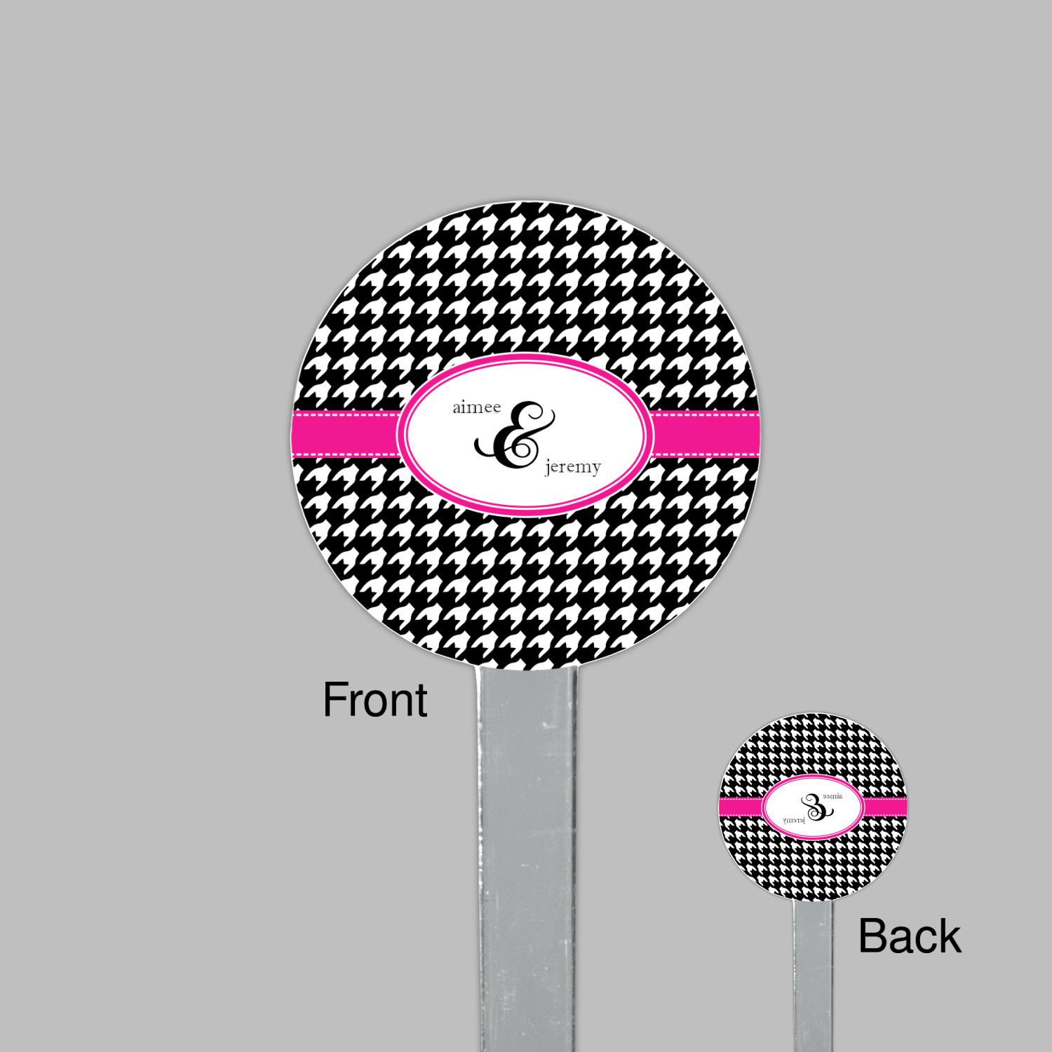 The hot pink band with a white stitch highlights the oval focal point to showcases personalization of the customer's choice.