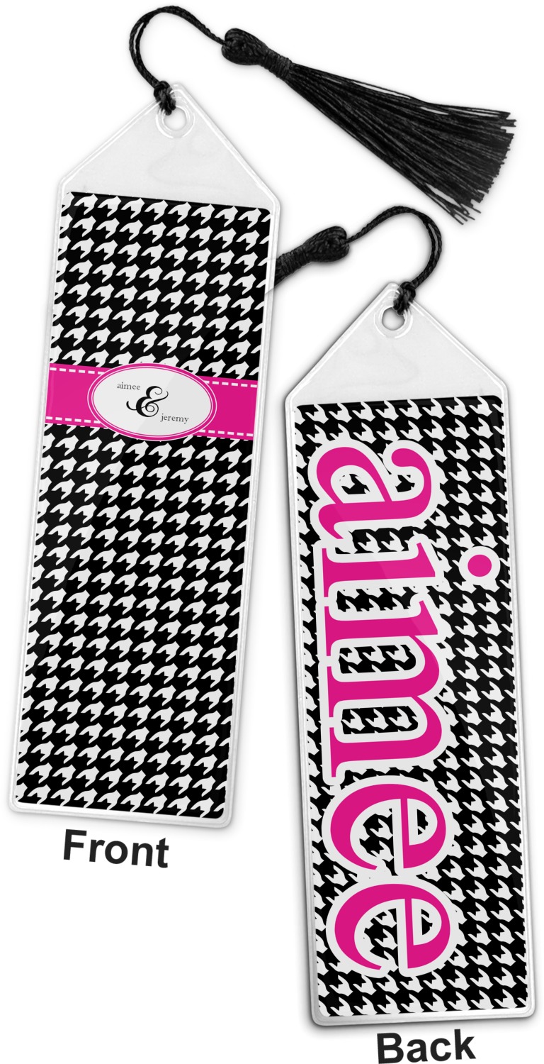 Your personalized bookmark is made of a sturdy, clear vinyl, and is approximately 7.5" x 2.25". We display your personalization on vinyl inserts that are placed on both sides. Accompanying each book marker is a black, fringe tassel that attaches to the reinforced, triangular header.