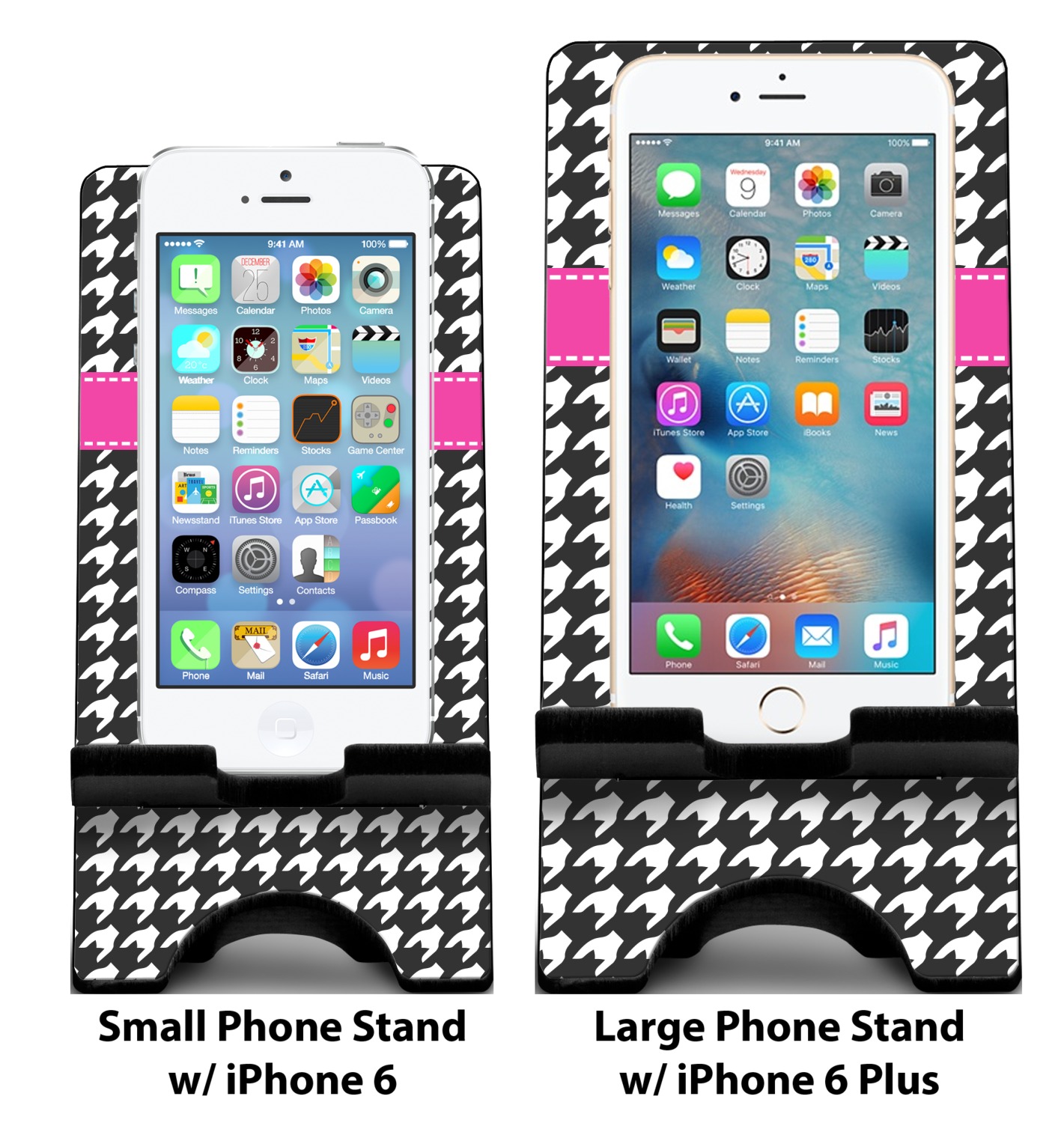 To meet your needs, we offer four variations of this IPhone stand. The backboard of the first version is shaped as a plain, yet sleek rectangle, and is available in two sizes. Our smaller size is approximately 4 by 3.25 by 7 inches, while the larger model is 4 by 3.77 by 8.5 inches. Alongside this model, we also provide you with a more decorative option. The upper part of our second version features a curved edge, for a classy, suave appearance. This phone holder is also sold in two sizes: a smaller version, which is 4 by 3.25 by 7 inches, and our larger model, which is 4 by 3.77 by 8.5 inches. Both models will support large phones, but the larger model is better if you wish to proudly display your personalized design.