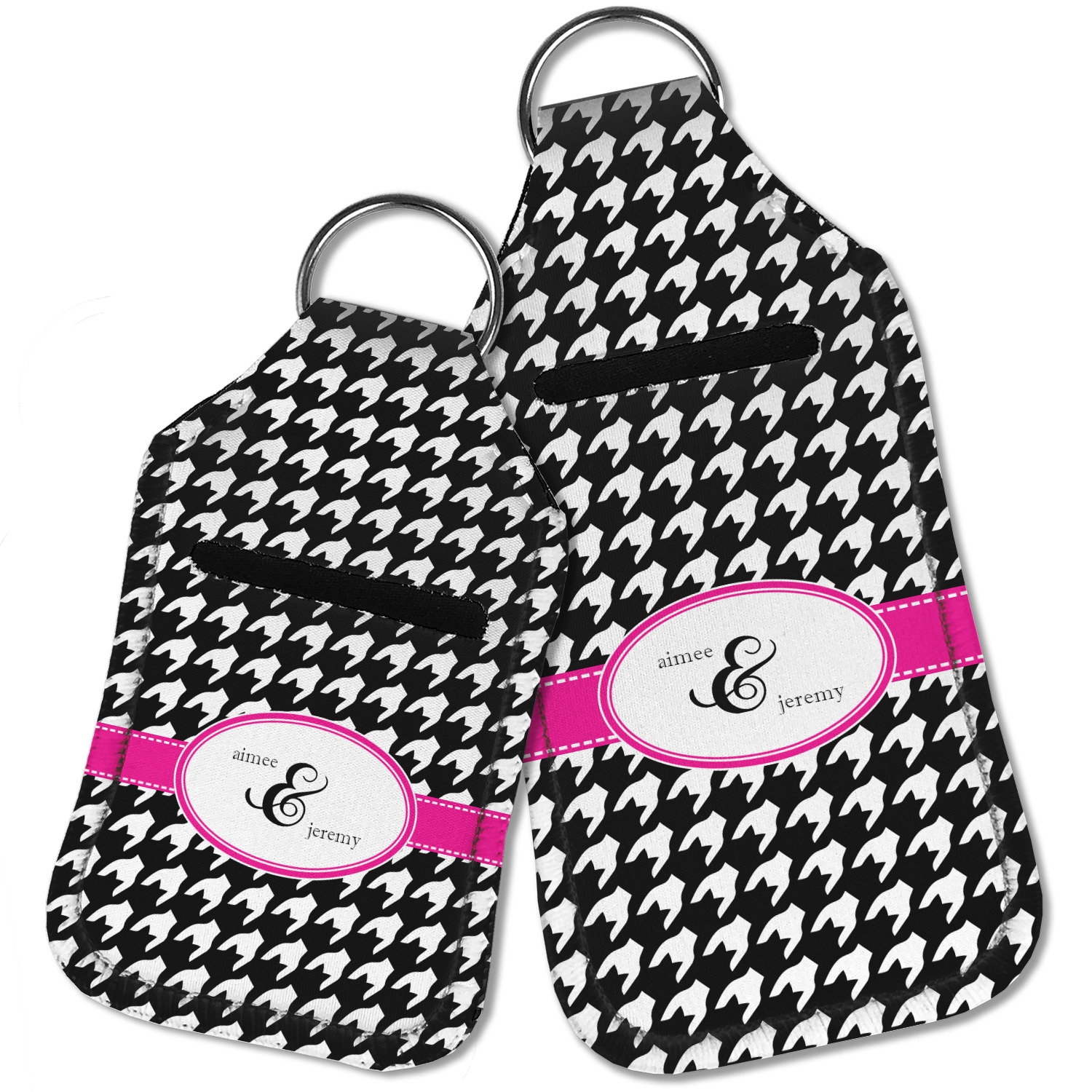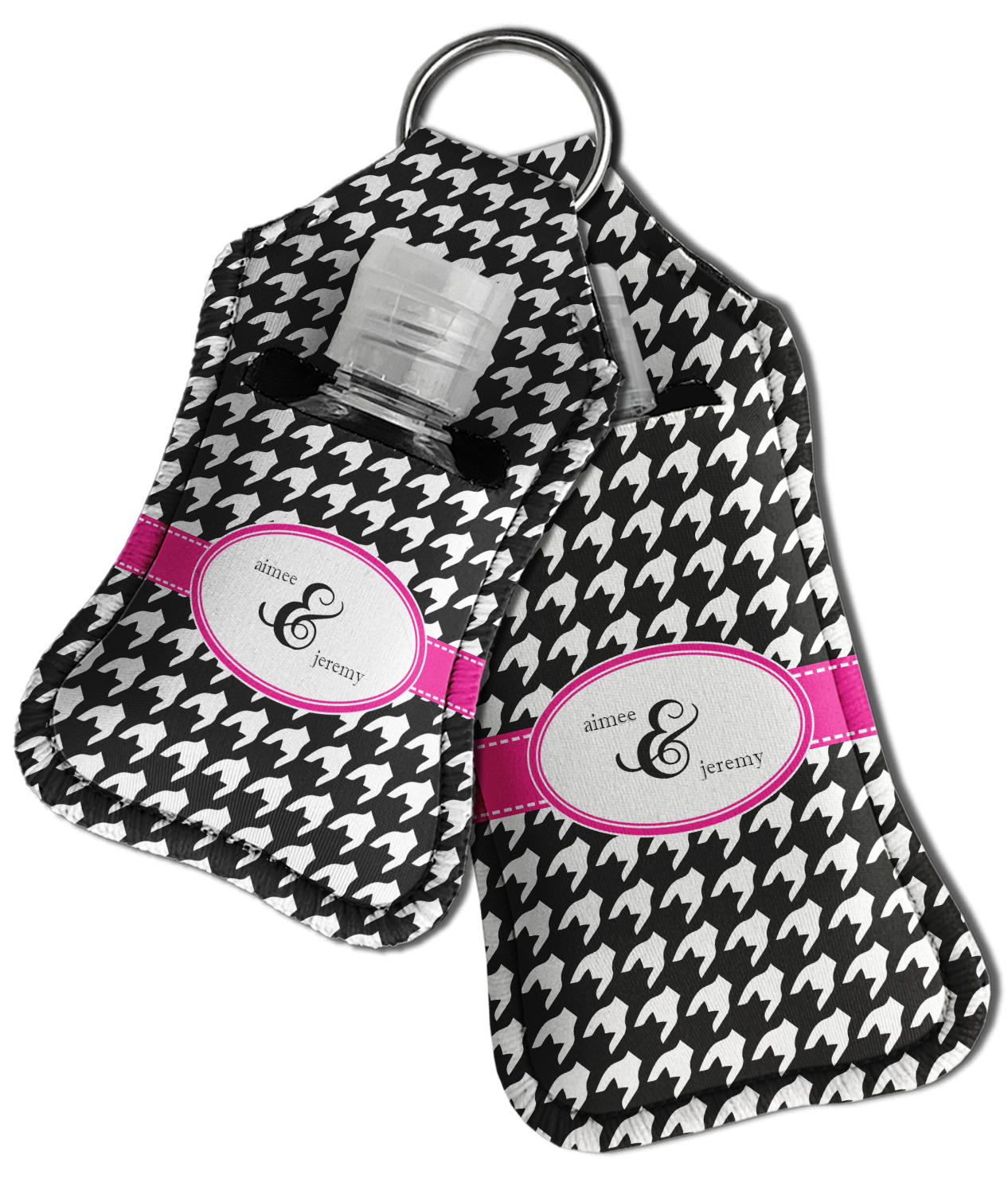 Each hand sanitizer holder comes with its own empty travel-sized, refillable hand sanitizer sure to fit snug in your customized sanitizer case! Our hand sanitizer cases are a durable, yet soft neoprene material sure to last any daily activities or travel agenda. Customize and personalize a hand sanitizer bottle holder with one of our two sizes - small (4.25" x 2.25") or large (5.5" x 2.5"). Each travel sanitizer holder comes with a keyring for attachment on bags, keys, or more!