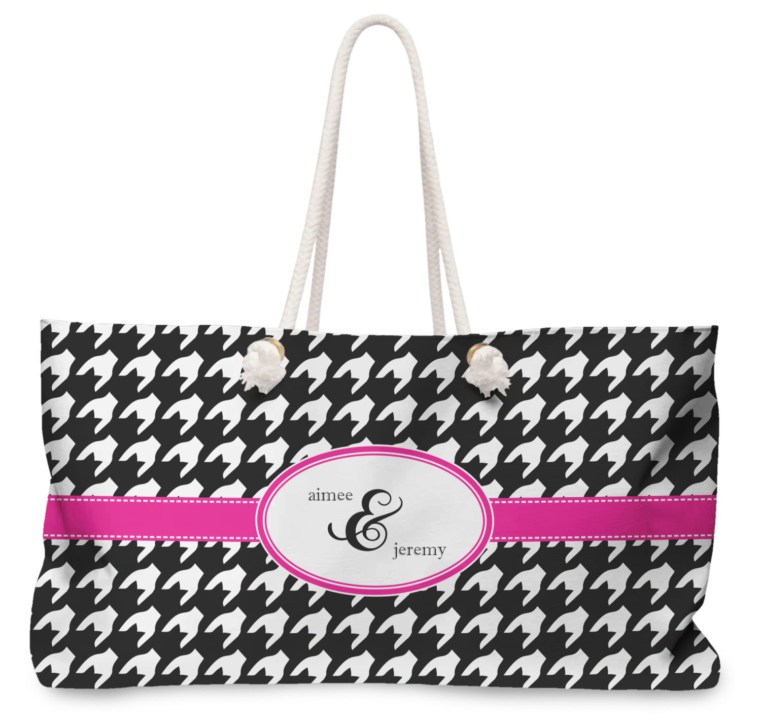 Our oversized weekender tote with rope handles is perfect for your weekend at the beach or on the town. This large tote are 24" W X 13" H, with a 5" gusset and a 27" thick rope handles with a knot that is put through a grommeted brass hole.
