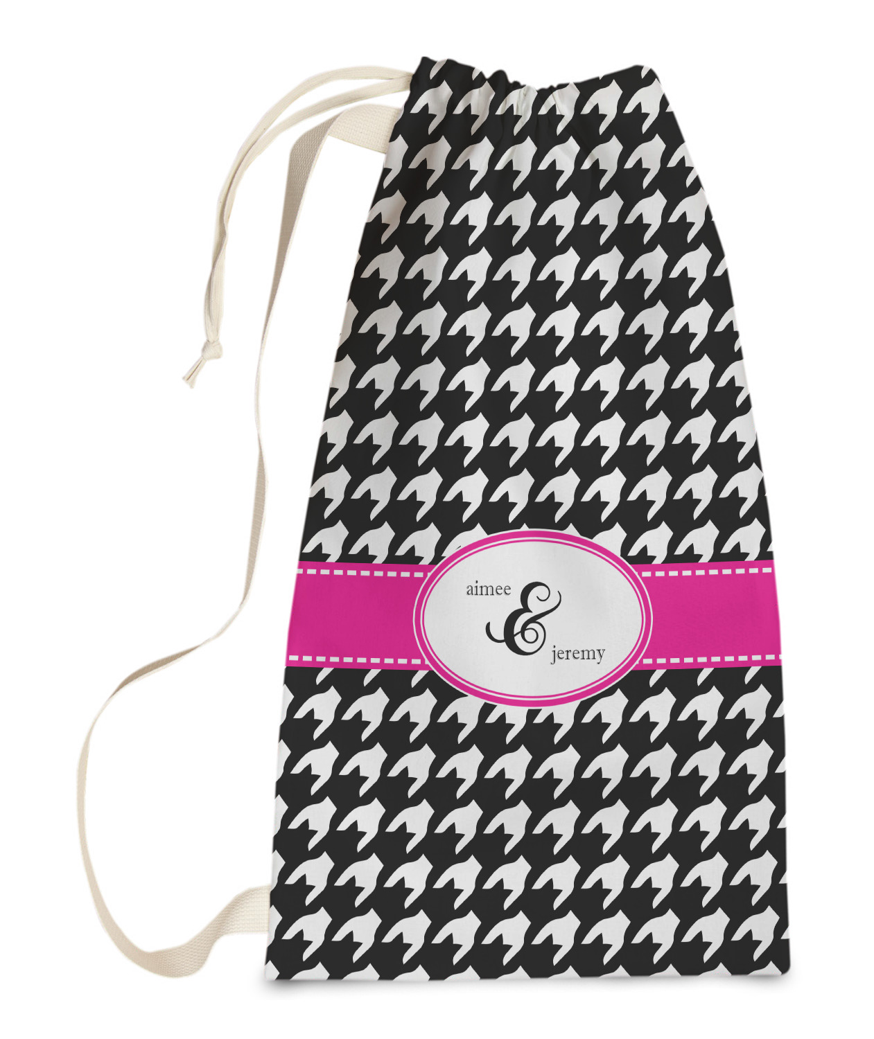 Carry your laundry in style with these customized laundry bags. Available in two sizes, featuring a natural colored woven strap and a cinch cord, these bags hold a lot of clothes or anything else you want to fit in them.