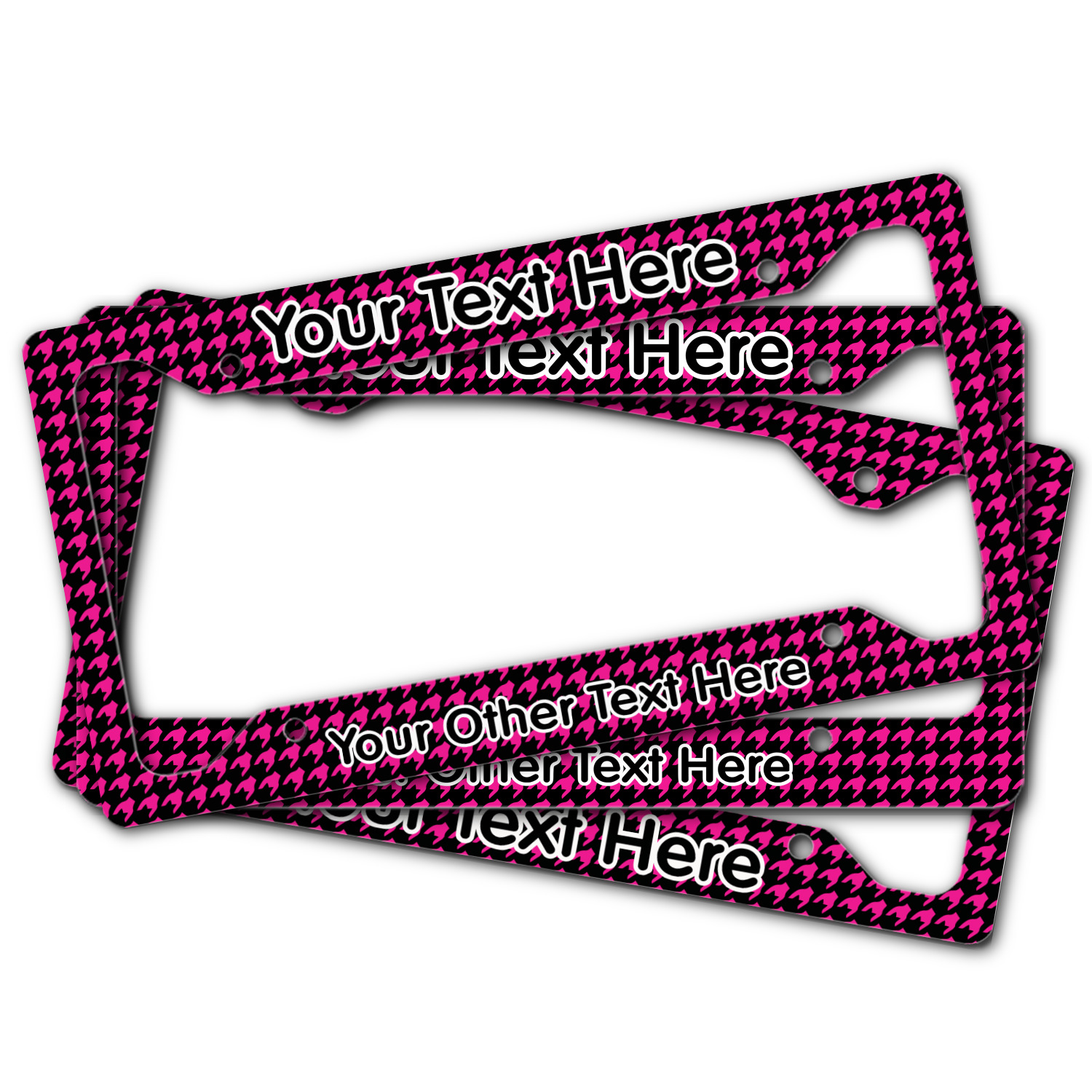 Each customizable license plate frame is made from a fine, yet sturdy aluminum material that measures approximately 6.5 x 12.15 inches, accommodating most standard license plates. The thickness allows the license plate frame to adhere completely to your license plate for a seamless look. We carry 3 styles of license plate frames to customize - Style A has texts on top and bottom, Style B offers texts on top and bottom as well as a full fill bottom border, and Style C offers text at the bottom only. The personalized license plate frame comes with four mounting holes for easy installation! We print each custom design across the frame with a glossy finish.