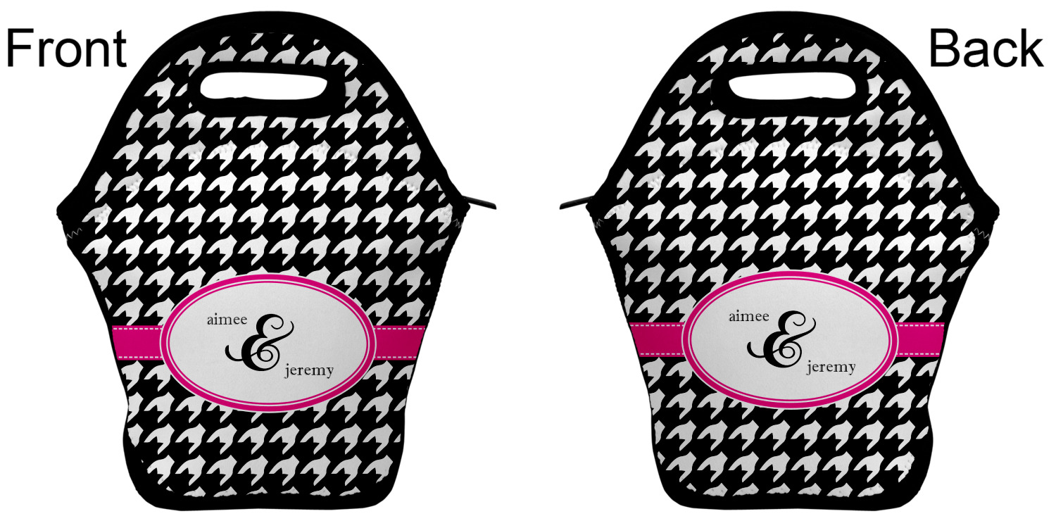 Our personalized lunch bags are made from a strong neoprene, and secure with a zipper closure that lines the top of the bag.The edges of the neoprene are sewn together with a heavy duty stitch, adding to the durability of the bag. The is accompanied by a reinforced handle at its top, for the easy transport of your lunch. We display your personalization across both the front and back of this neoprene lunch bag, while the remaining sides are a sleek black in color. Each bag measures at 13.5 inches tall, and 11.5 inches wide.