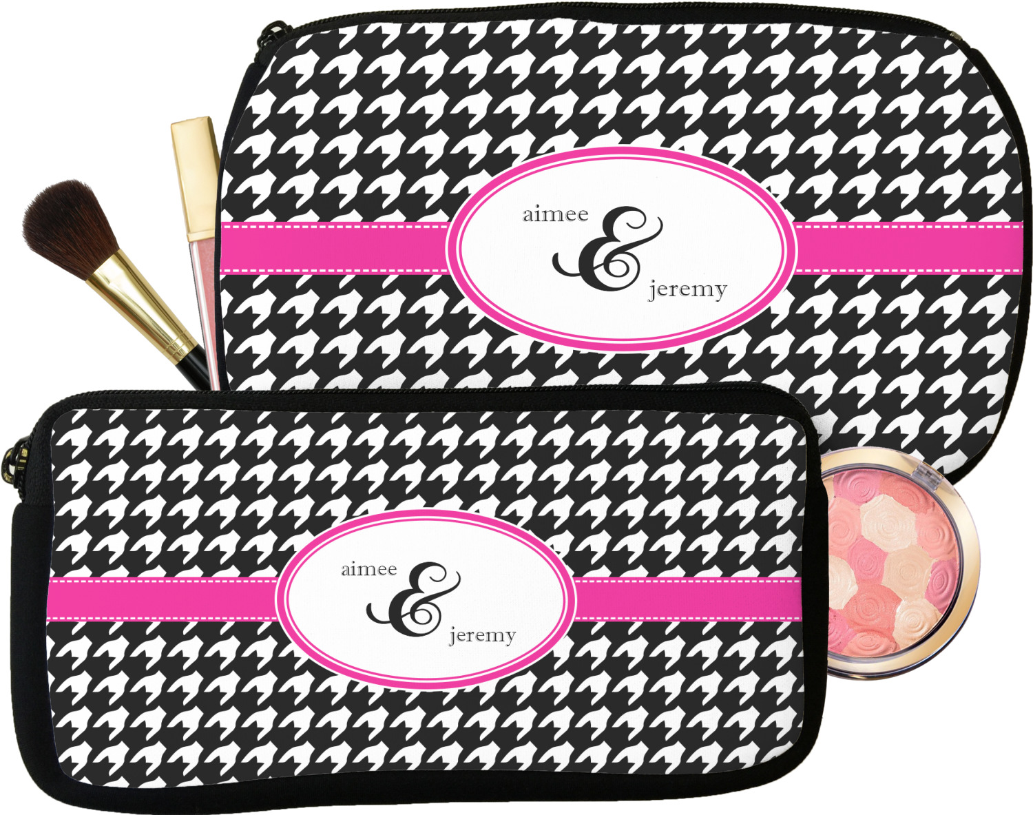 Our personalized makeup bags are available in many different designs, patterns and colors - so you are sure to find one that will love. They are made of neoprene (same material as wet-suits) and thus are water resistant, so spillages in your makeup bag will not end up all over you purse. They are customized on one side and are black on the other side and the zipper is black as well.