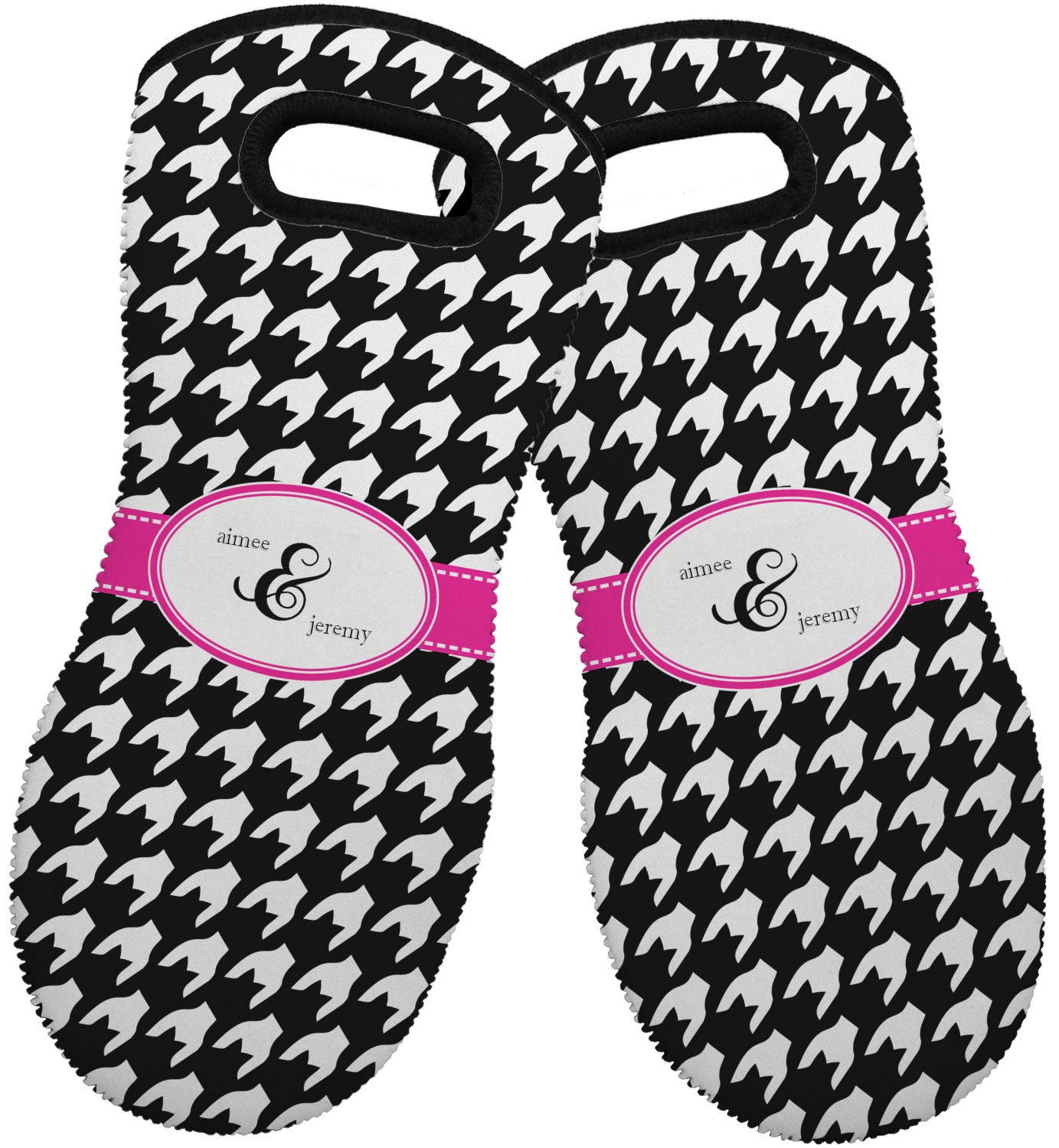 These heat resistant gloves are made entirely of a durable neoprene; the front features a softer texture, while the palm's side has a textured surface, meant to handle heat up to 500 degrees Fahrenheit. Thick, heavy duty stitching connects the two sides. A small, oval cutout appears on the front, and can be used to hang and store the mitt. Your personalization appears on the front, and the upper part of the back of the mitt. The style of these oven mitts are suitable for both the right and left hand, depending on your needs. If you need one for each hand, be sure to order two!